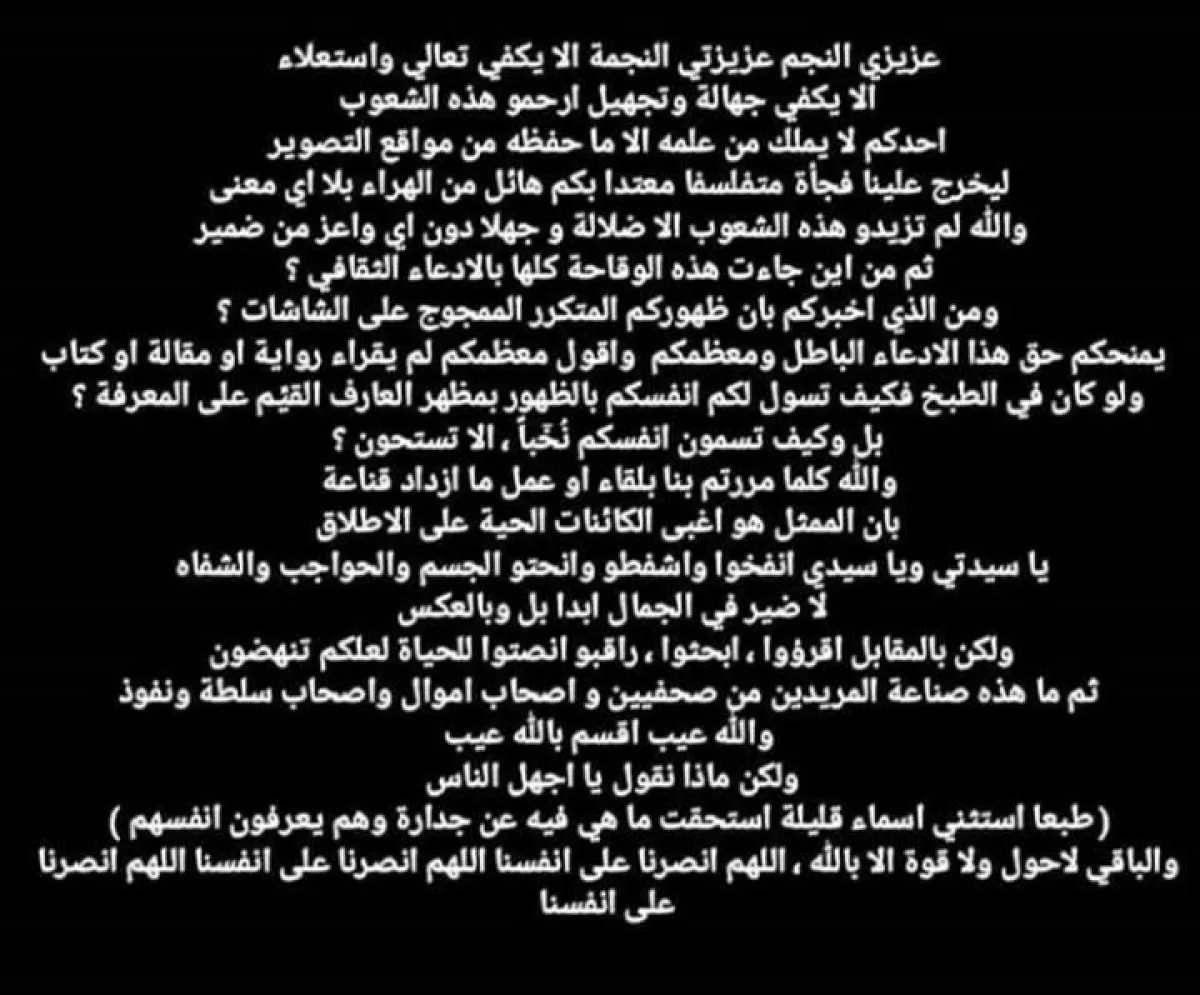 وكتب النجم السوري عبر صفحته الرسمية على موقع "إنستقرام": عزيزي النجم عزيزتي النجمة ألا يكفي تعالي واستعلاء ألا يكفي جهالة وتجهيلاً، إرحموا هذه الشعوب أحدكم لا يملك من علمه إلا ما حفظه من مواقع التصوير ليخرج علينا فجأة متفلسفا معتداً بكم هائل من الهراء بلا لأي معنى والله لم تزيدوا هذه الشعوب الا ضلالة و جهلا دون أي واعز من ضمير. ثم من أين جاءت هذه الوقاحة كلها بالادعاء الثقافي؟ ومن الذي اخبركم بأن ظهوركم المتكرر الممجوج على الشاشات يمنحكم حق هذا الادعاء الباطل ومعظمكم وأقول معظمكم لم يقرأ رواية أو مقالة أو كتاب ولو كان في الطبخ، فكيف تسوّل لكم أنفسكم بالظهور بمظهر العارف القيِّم على المعرفة؟ بل وكيف تسمون أنفسكم نخباً، ألا تستحون؟ والله كلما مررتم بنا بلقاء أو عمل ما إزداد قناعة بأن الممثل هو أغبى الكائنات الحية على الإطلاق".