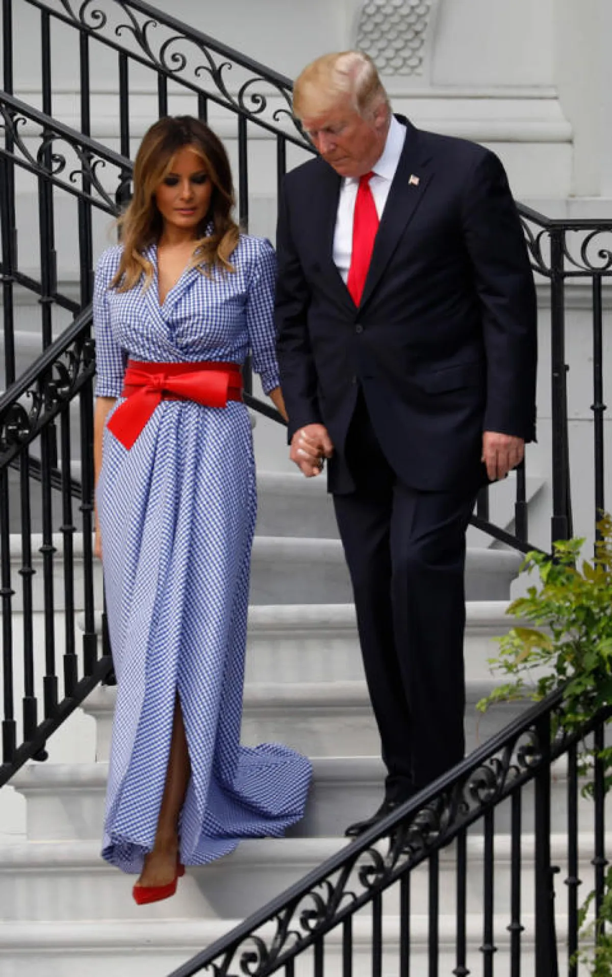 وقد ارتدت ميلانيا فستانًا باللونين الأبيض والكحلي من تصميم رالف لورين، ثمنه حوالى 2800 دولار أمريكي، وقد توسطه حزام جلديباللون الأحمر من دار ألكسدر ماكوين،ثمنه حوالى950 دولارًا، وحذاء باللون عينه أيضًا من كريستيان لوبوتان.
