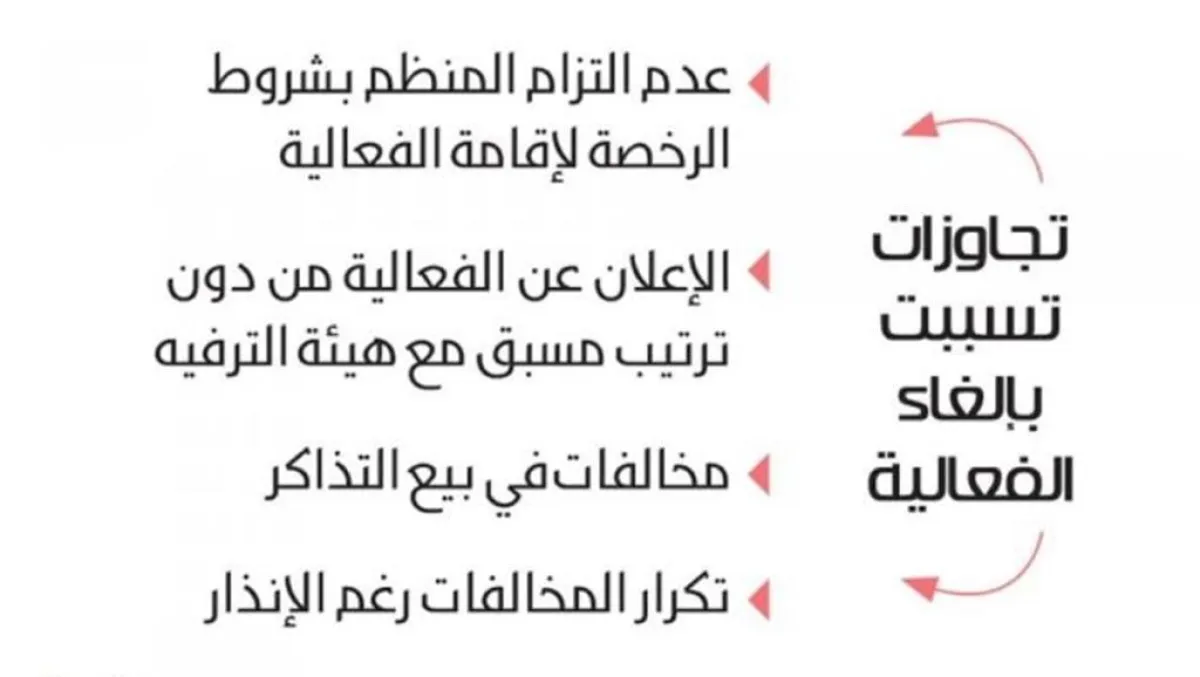 وأوضحت الهيئة، عبر موقعها الإلكتروني، أنها اتخذت قرارها مضطرة، بعد سلسلة متكررة من التجاوزات ارتكبتها الجهة المنظمة، بينها عدم الالتزام بالاشتراطات الخاصة بالتنسيق المسبق مع الهيئة، فيما يخص حملات الترويج الخاصة بالفعالية وبيع التذاكر.