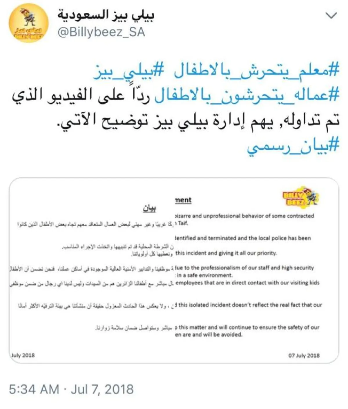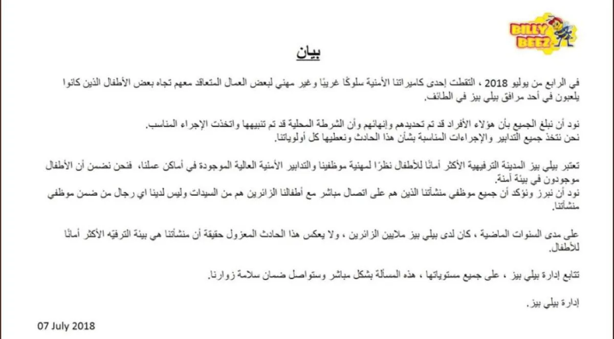 وأشارت إلى أن جميع موظفي منشآتها، الذين على اتصالٍ مباشر مع الأطفال، هم من النساء، مؤكدة في نهاية بيانها، أنها ستتابع الواقعة بشكل مباشر لضمان سلامة الزوار.