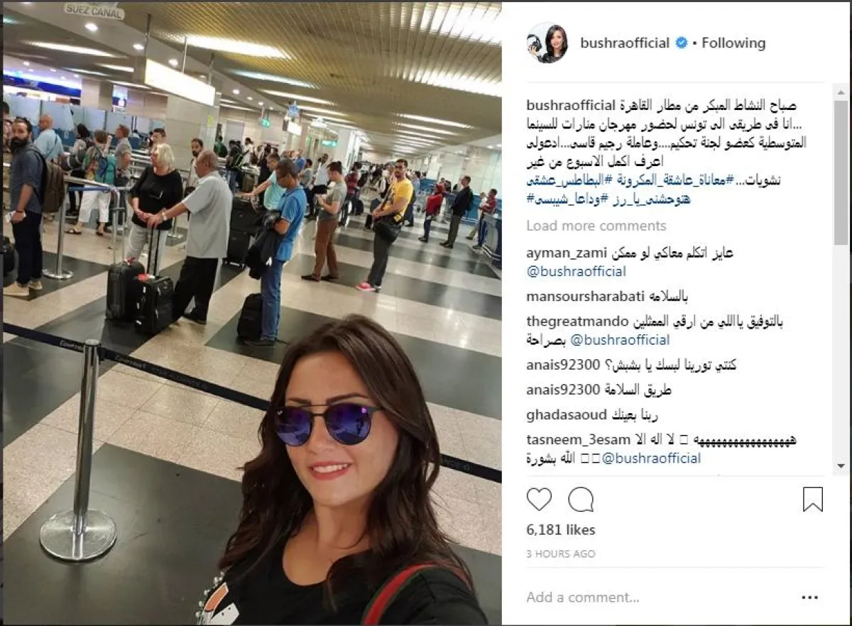 نشرت الفنانة المصرية بشرى صورة لها على حسابها الرسمي على انستقرام أثناء تواجدها في مطار القاهرة الدولي لإنهاء إجراءات سفرها إلى تونس، حيث ستحل ضيفة على مهرجان منارات للسينما المتوسطية كعضو لجنة تحكيم خلال أيام المهرجان في الفترة ما بين 9 يوليو وحتى 15 من الشهر نفسه، إلى جانب مجموعة من الممثلات العرب والأجانب، ومنهم الفلسطينية منال عوض والفرنسية من أصل لبناني منال عيسى.