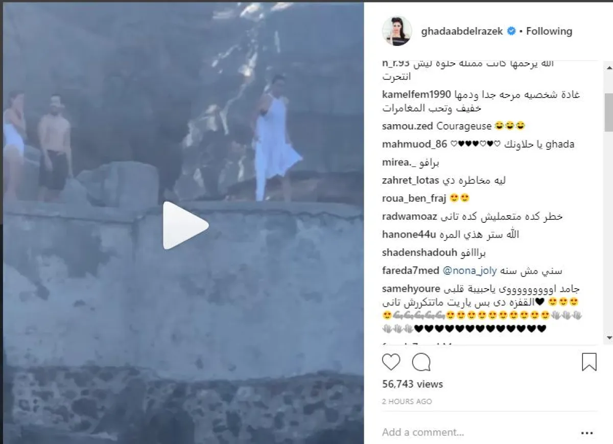 غادة تخلت عن الظهور علناً بالمايوه منعاً للانتقادات المعتادة وعبارات التجريح المتعلقة بالسن، وارتدت "كاش مايو أبيض" طويل نسبياً فوق ملابس السباحة، وقدمت في مقطع الفيديو ثباتاً انفعالياً ملحوظاً، وأظهرت زاوية التصوير اللقطة بخطورة مضاعفة، لوجود صخور جانبية بدت قريبة جداً من غادة اثناء تنفيذ القفزة.