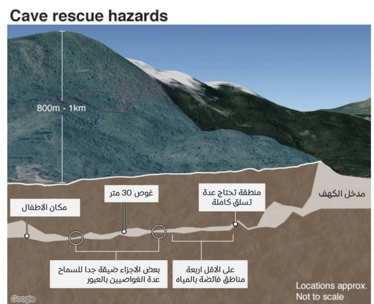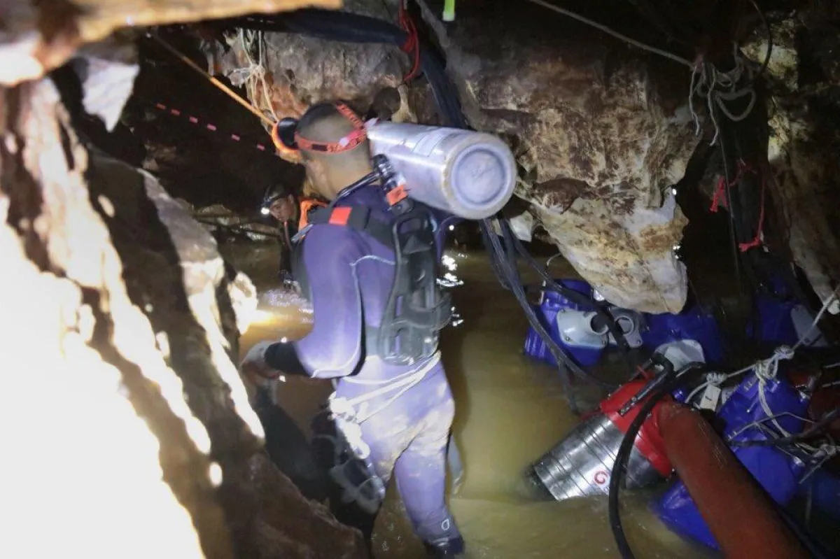 وفي التفاصيل، بدأت عملية الإنقاذ التاريخية في كهف "ثام لاونج"، بمشاركة 18 غواصاً، الأحد الماضي، ويقبع الأطفال على مسافة 800 متر تحت سطح الأرض، وهو ما يعادل ضعف ارتفاع ناطحة السحاب الأمريكية "إمباير ستيت".