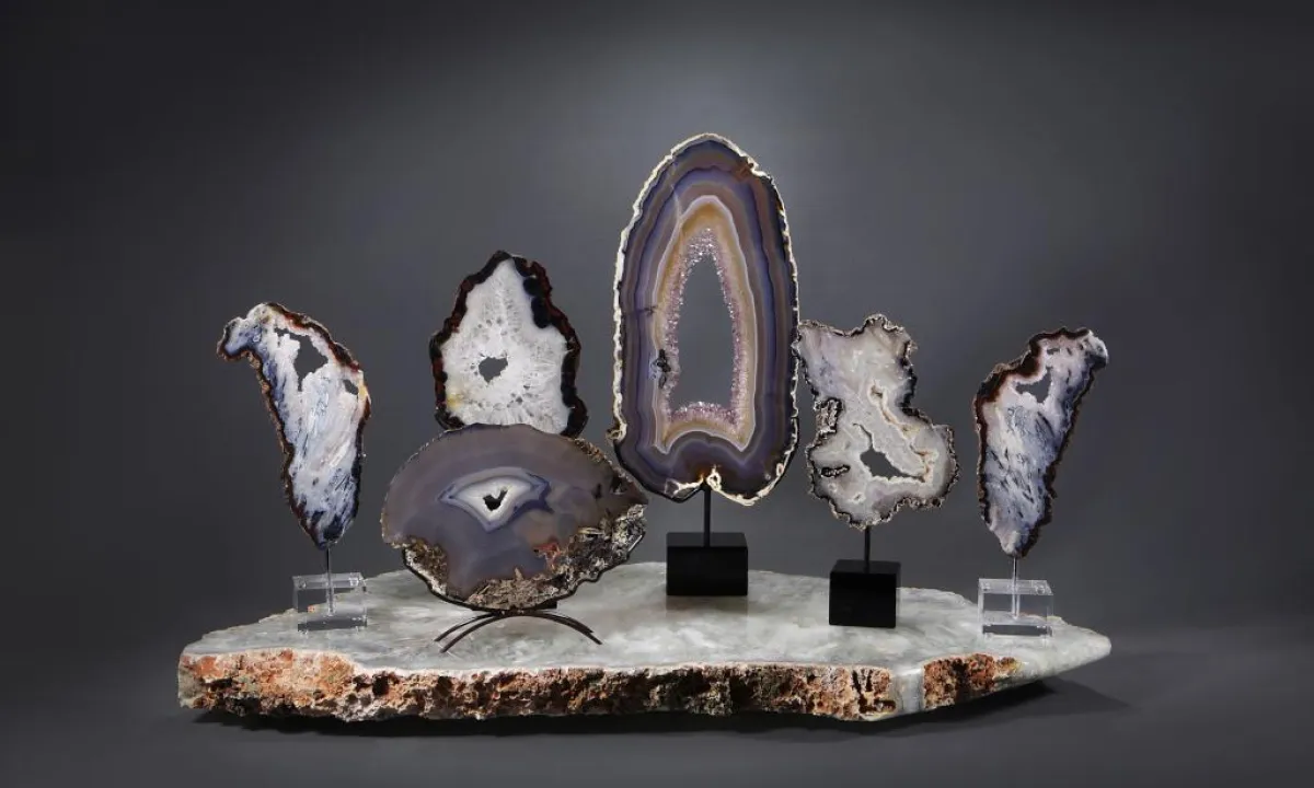 • الأحجار شبه الكريمة في الأثاث والتحف الفنيَّة: اتَّسعت تصاميم الأثاث المصنوعة من الأحجار شبه الكريمة لتشمل طاولات الطعام والطاولات الجانبيَّة وتلك الوسطيَّة و"الكونسولات" وفواصل الزينة (بارافان)... ولا تحتاج هذه القطع إلى إكسسوارات لإثرائها، كما هي طاولات الخشب التقليديَّة، بل إنَّ الأولى ثريَّة بذاتها.