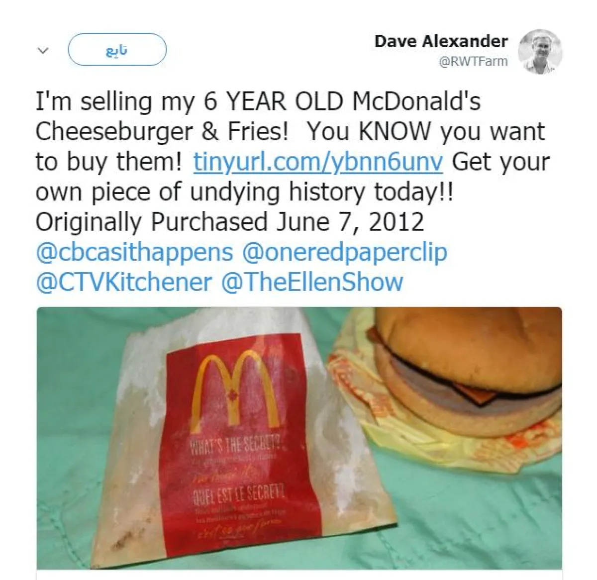 وبحسب ما نشرته مجلة "تايمز Time" الأميركية فإن المزارع الكندي "ديف أليكساندر"، كان قد قرر أن بيع وجبة سريعة مكونة من شطير "برغر" مع البطاطا المقلية، كان قد اشتراها قبل أكثر من 6 أعوام، وتحديداً في 7 حزيران / يونيو من العام 2012، وبمبلغ وصل إلى 150 دولار أمريكي، وما زالت هذه الوجبة كما هي، رغم وجود بعض التغيرات التي طرأت على مكوناتها مثل البطاطا والجبنة بكل تأكيد.