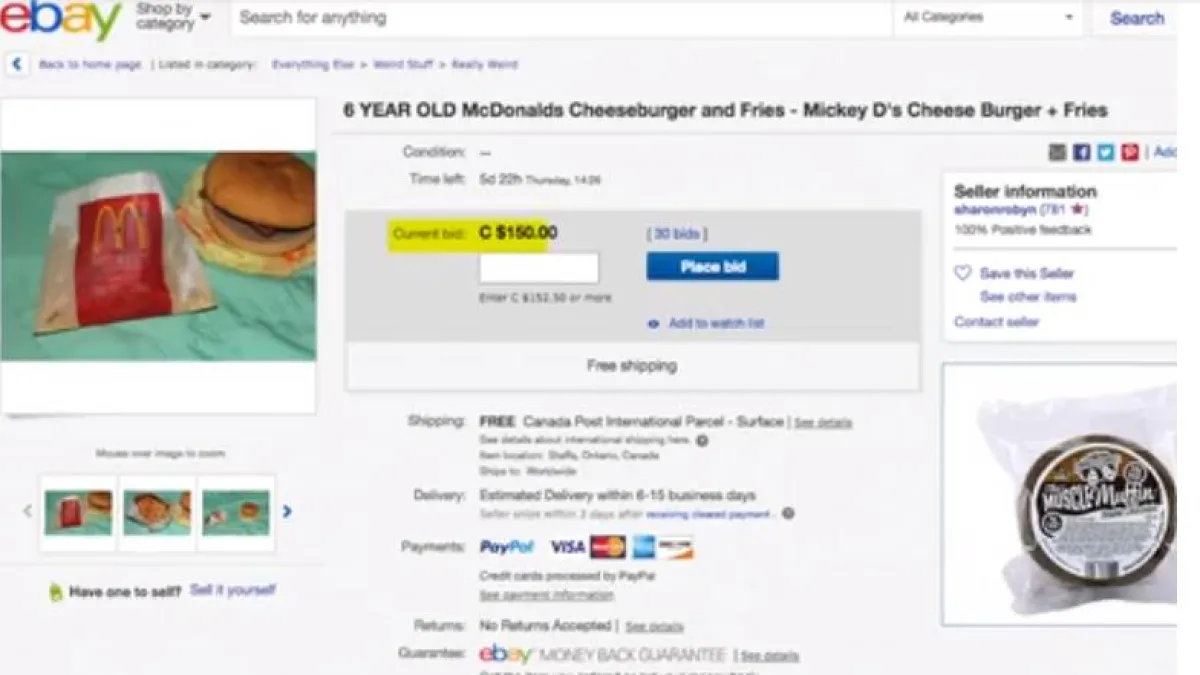 دائماً ما نسمع بقيام أشخاص من مختلف دول العالم، بعرض أشياء تكون ذا قيمة مادية أو معنوية كبيرة عبر مواقع البيع الإلكتروني على شبكة الإنترنت، ربما هو نفسه لا يدرك هذه القيمة الثمينة، كالأشياء التاريخية مثلاً، ولكن، وعلى الجانب الآخر هناك من يقومون بعرض أشياء غريبة وأحياناً سخيفة للبيع على هذه المواقع ذاتها، فمنهم من قد يعرض حذاءاً أو ساعة قديمة، إلا أن أغرب هذه الأشياء التي عُرضت ليشتريها الناس، كانت ما أقدم على فعله مزارع كندي، بعد أن عرض وجبة من الـ"برغر"، يتجاوز عمرها الست سنوات للبيع على موقع "إي باي eBay" الخاص بالبيع الإلكتروني عبر شبكة الإنترنت.