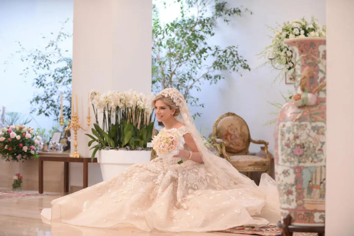 عروس لبنانية اختارت فستان زفاف ملكيًّا من توقيع زهير مراد، تميز بقصّة الـBall Gown مع حمّالات عريضة منسدلة قليلًا وفتحة صدر V.