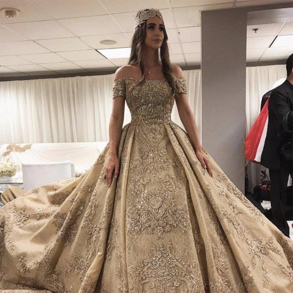 الفستان بصيحة الـOff Shoulder ومزين بتطريزات فاخرة من الكريستال، والفصوص البرّاقة مع تنورة منفوشة.