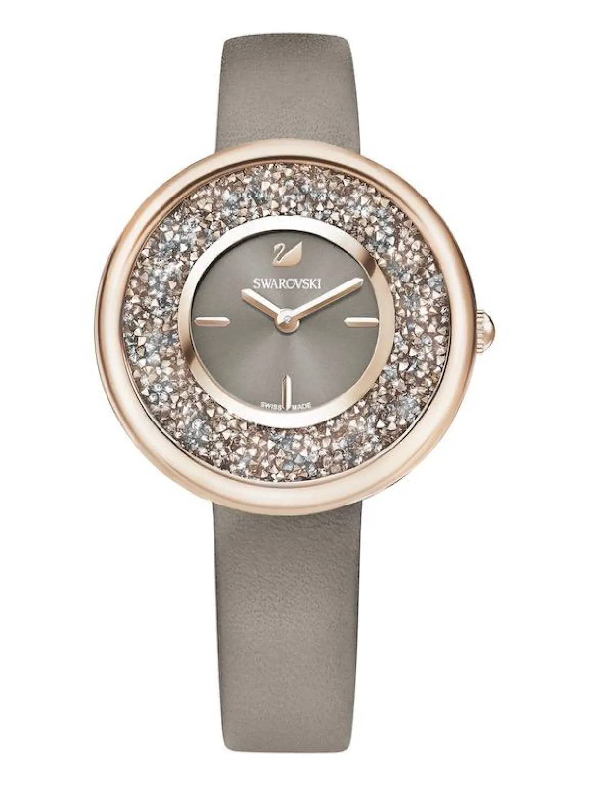 تأتي ساعة Crystalline Pure المثالية لموسم العطلات في غلاف بلون أصفر ذهبي مناسب لجميع الأوقات ومرصع بحوالي 850 قطعة كريستال بلون ذهبي وردي مع حزام رمادي داكن من الجلد الأصلي.