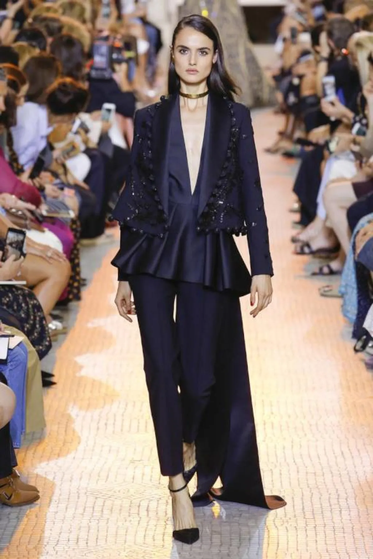 الصبية التي تتمتع بأكتاف عريضة، احرصي على ارتداء تصاميم بـ أكمام طويلة، بشكل مستقيم، ويفضل أن تكون بلون داكن، مثل التصميم الكحلي بـ البلايزر و البنطلون من إيلي صعب Elie Saab، مع فتحة حرف v الكبيرة، لكي تبدي بشكل أنحف من هذه المنطقة، كما أن تصميم البنطلون المصنوع من القماش بكسرة من الأمام، يجعلكِ تبدين أطول مما أنت عليه.
