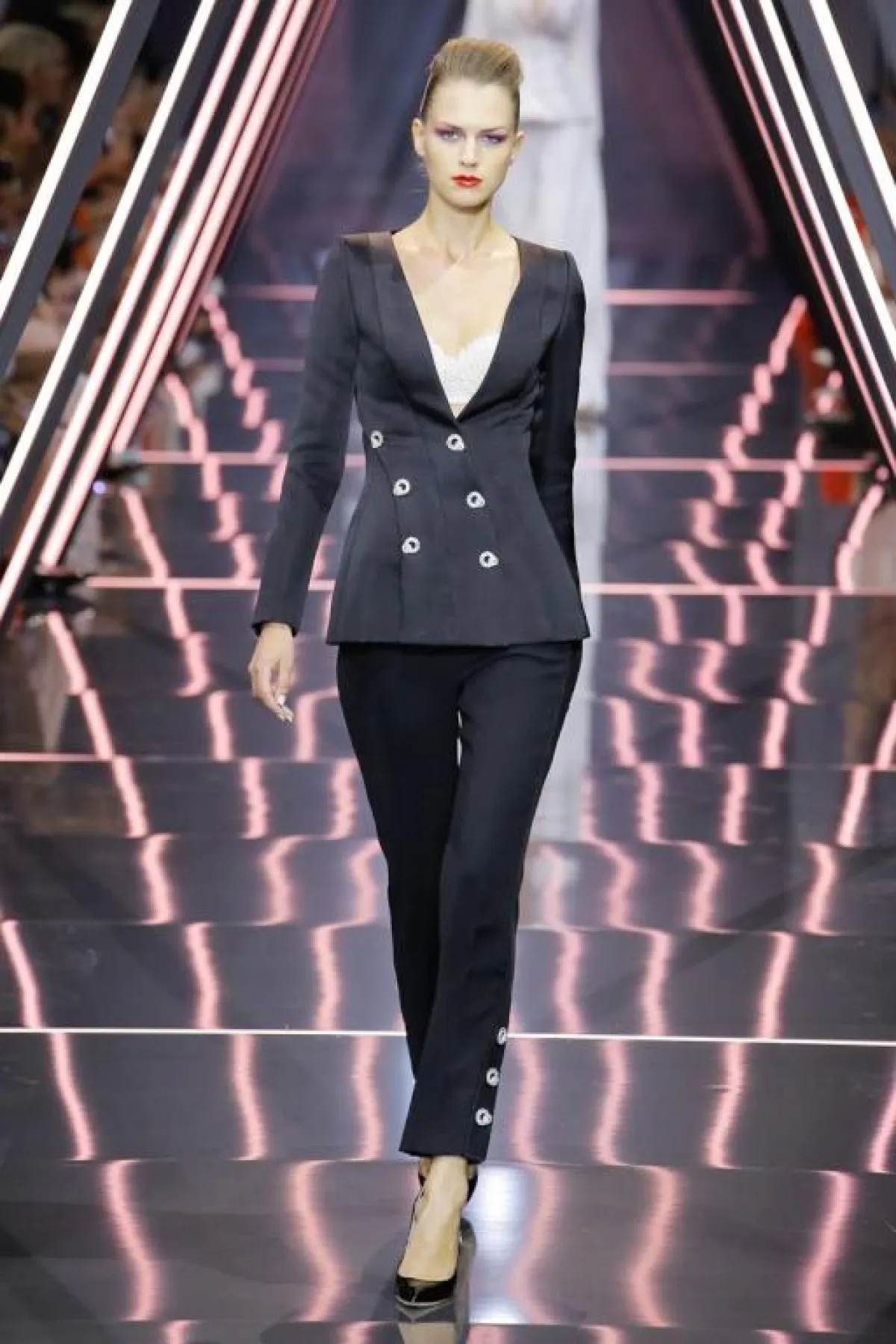 كانت عنوان دار أزياء فالنتينو valentino بتصميم عالي الخصر المثالي لكل صبية تبحث عن إطلالة رشيقة، كما أن اختيار الكاب الطويل مع البنطلون، يمنح الفتاة طولًا مضاعفًا، بالإضافة إلى الحذاء حرف v لإطلالة متكاملة للممتلئات.