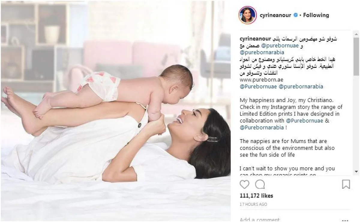 نشرت الفنّانة اللبنانية سيرين عبد النور صورتين على حسابها الشخصي على «انستقرام»، وكانت تحمل طفلها كريستيانو، وقد وجّهت العدسة إليها ولم تُظهِر ملامحه كاملة؛ حيث ظهر الطفل بظهره وهو يبتسم لوالدته. وقد ارتدت سيرين فستاناً أبيض مكشوف الظهر والكتفين في إحدى الصورتين، وعلّقت قائلة: «لما بيضحك بشوف الدنيي كلها عم بتضحك بعيوني ضحكة صغيرة منو بتكبرلي قلبي وبتزيدو فرح #غرام #فرح #ضحك #سعادة #ابني #كريستيانو». وعلقت على الصورة الأخرى قائلة: «شوفو شو مهضومين الرسمات يللي صممتن مع @purebornuae وهيدا الخط خاص بابني كريستيانو ومصنوع من المواد الطبيعية».
