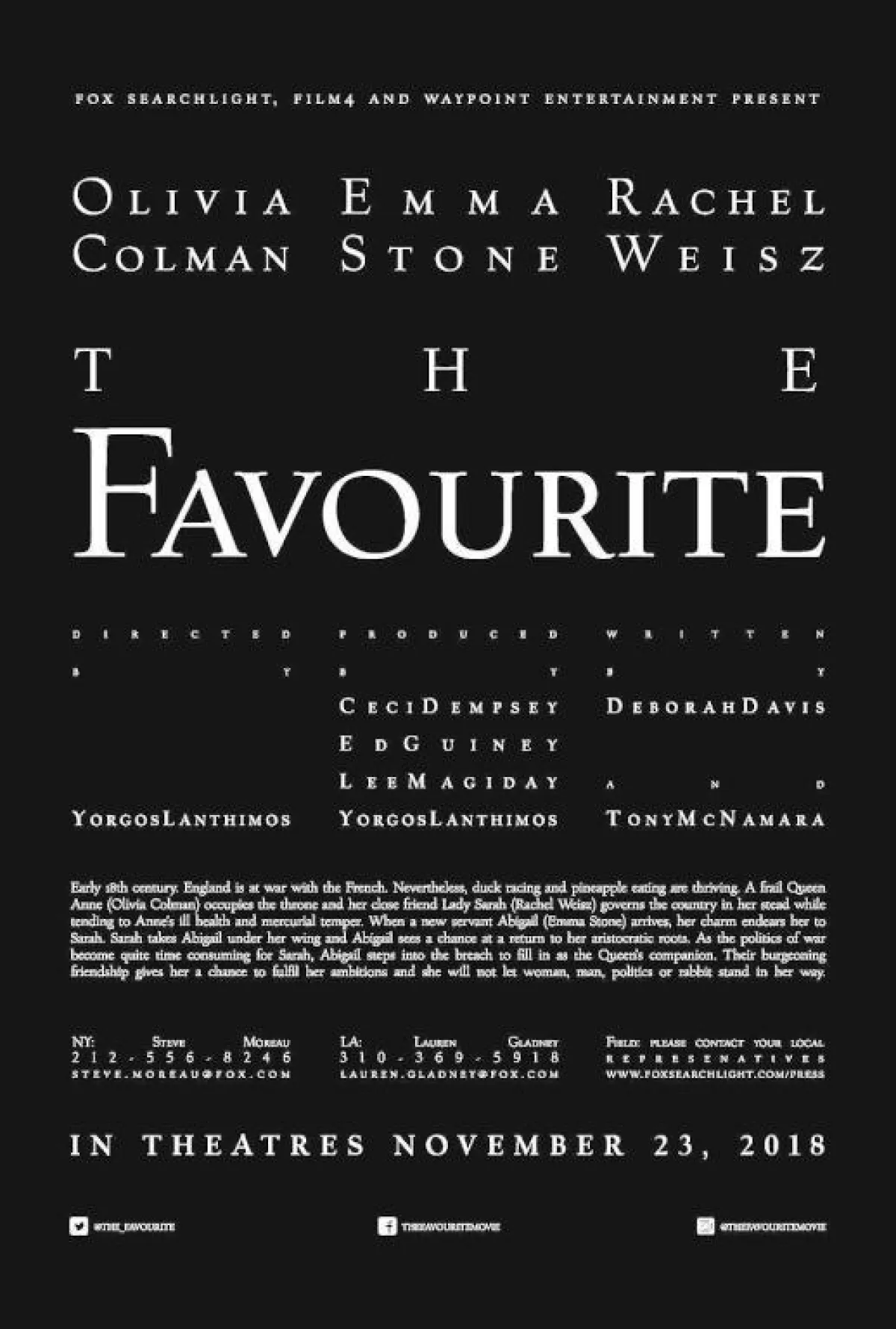 طرحت شركة فوكس سيرش لايت الترفيهية الإعلان التشويقي الرسمي الأول لفيلم السيرة الذاتية والتاريخ "The Favourite" للنجمة إيما ستون، والمقرر طرحه في 23 نوفمبر 2018.