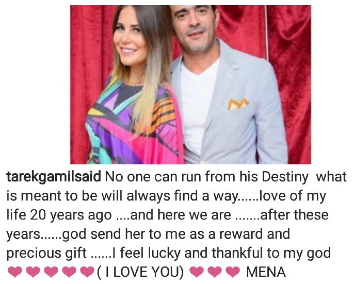 أعلن المحامي طارق جميل سعيد زواجه من منة حسين فهمي، بنشر صورة تجمعهما سوياً كتب تعليقاً عليها :"لا أحد يهرب من مصيره، حب حياتي منذ 20 عامًا.. أصبحنا سويًا بعد كل هذه السنوات.. ربنا أرسلها لي مكافأة .. وأنا محظوظ بذلك".