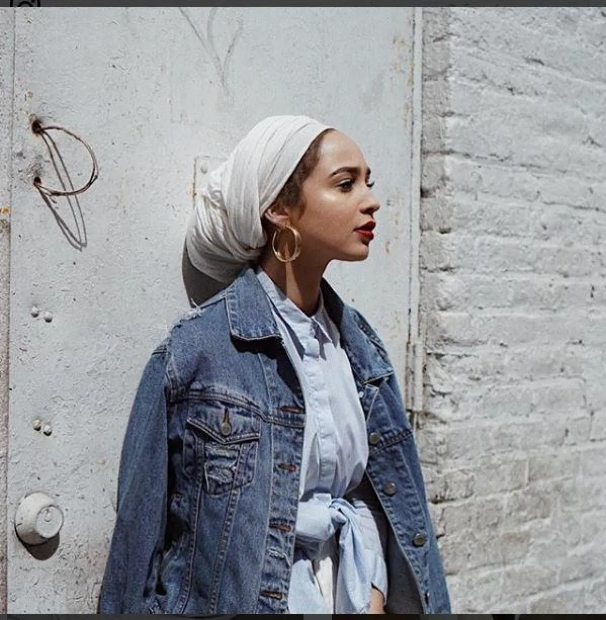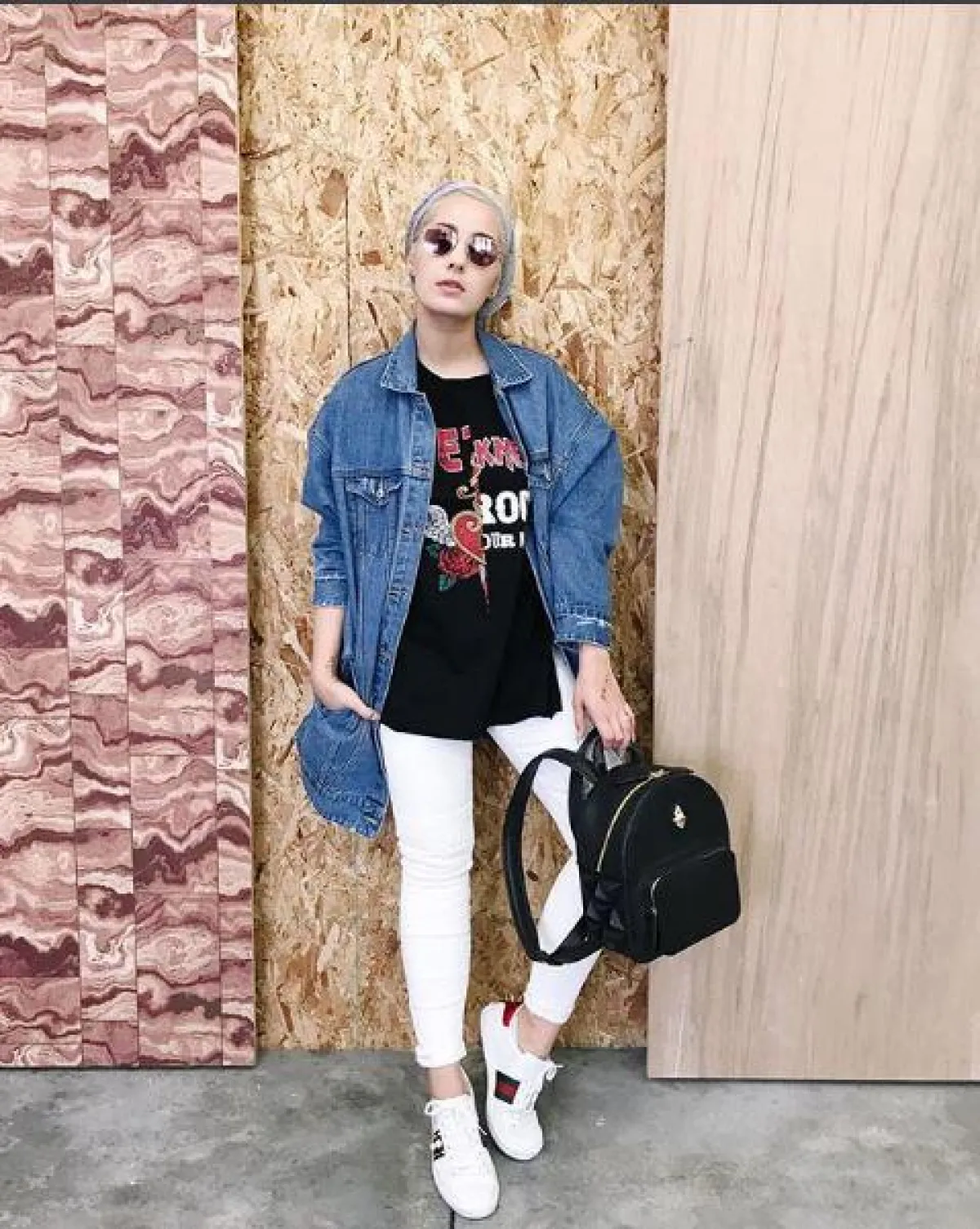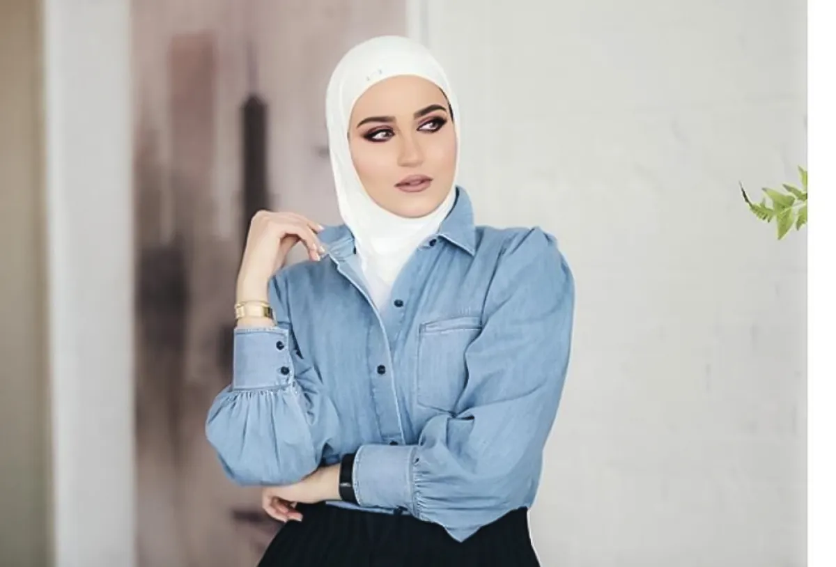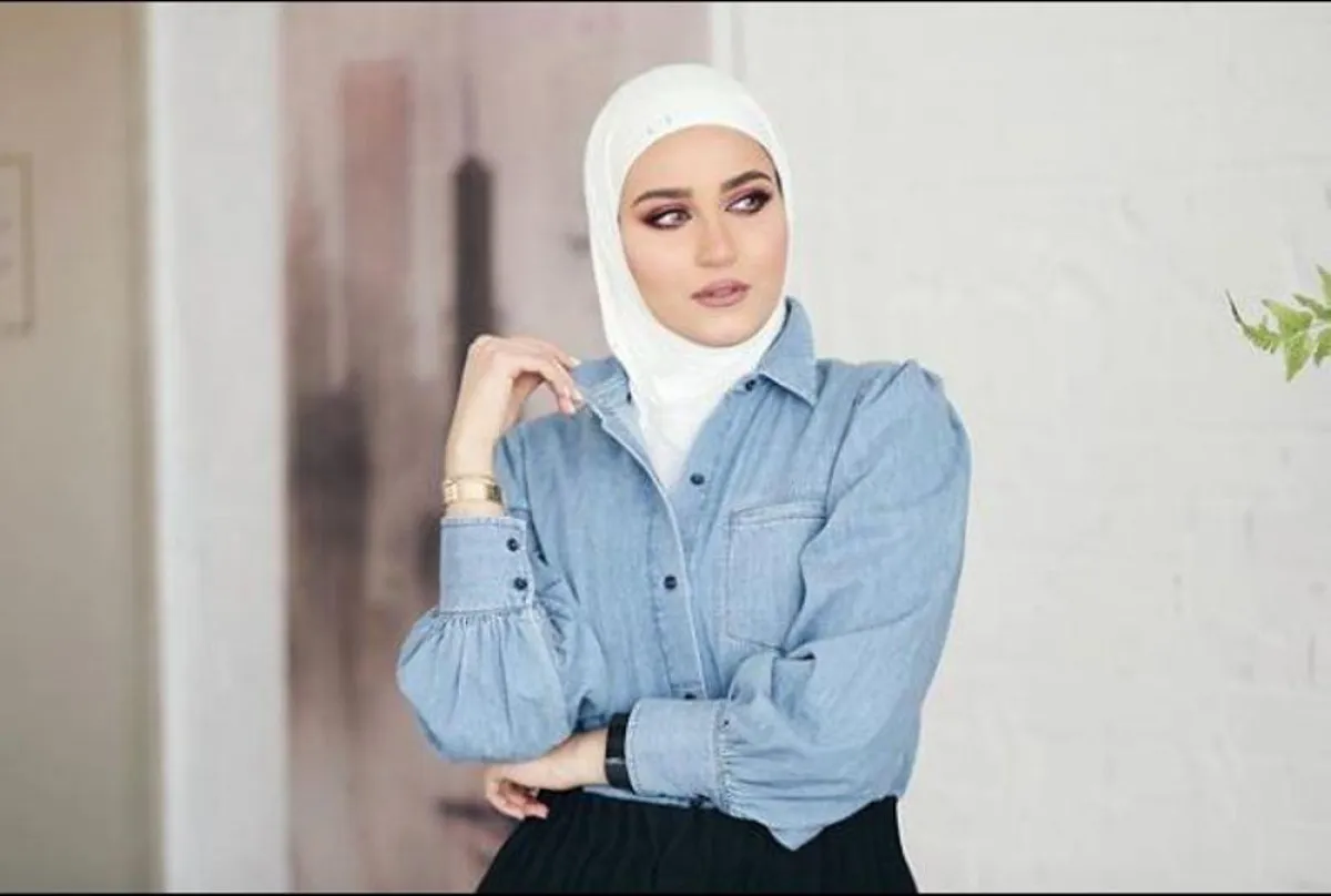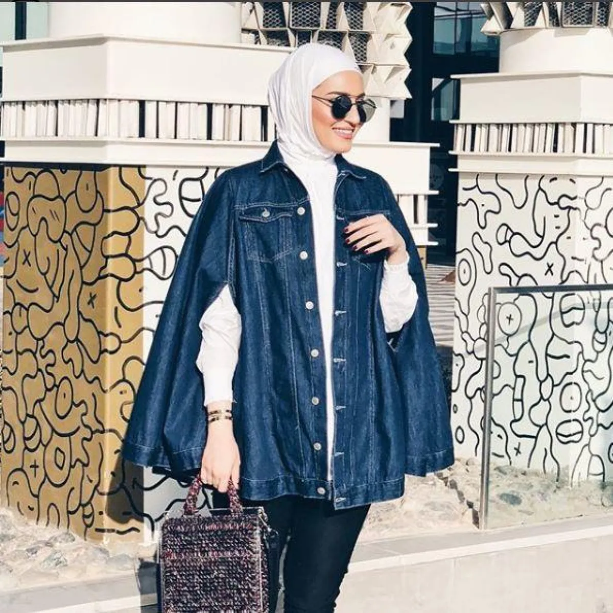 اختارت مدونة الموضة الكويتية دلال الدوب الجاكيت الجينز بتصميم الكاب وأكمام واسعة ، وارتدته مع قميص كلاسيكي أبيض، وطرحة بيضاء، لإطلالة نهارية تناسب العمل، والمقابلات المهمة.