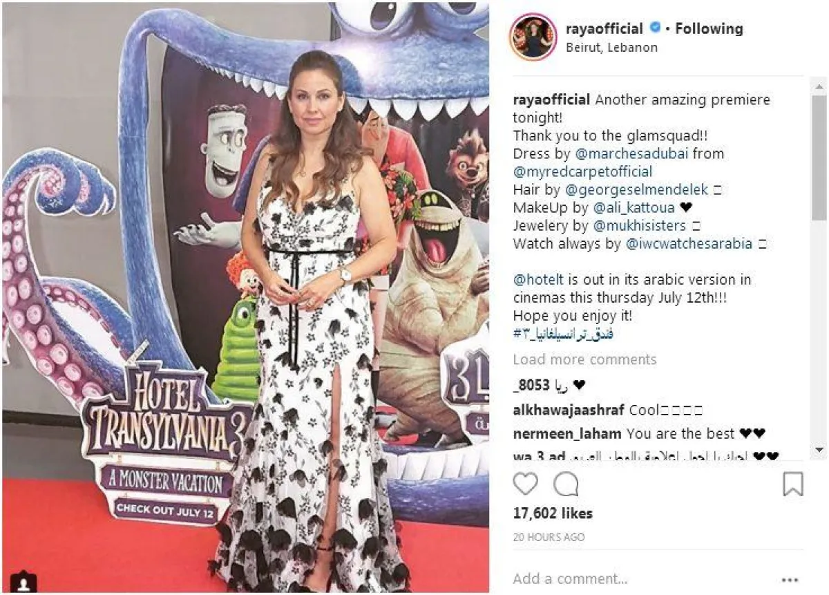 وقد ظهرت راشد في الصورة وهي تقف أمام البوستر الرسمي لفيلم الكارتون العائلي «أوتيل ترانسلفانيا 3» والتقطت الصور لها، وعلّقت عليها قائلة: «عرض آخر مذهل الليلة!»، كما شكرت في تدوينتها كلاً من مصفف الشعر، والاستايلست، ومصمم الفستان، وصائغ المجوهرات التي ارتدت، حيث ارتدت ساعة يد وعقداً ألماسياً، وفستاناً أبيض منقوشاً بالزهور البنية.