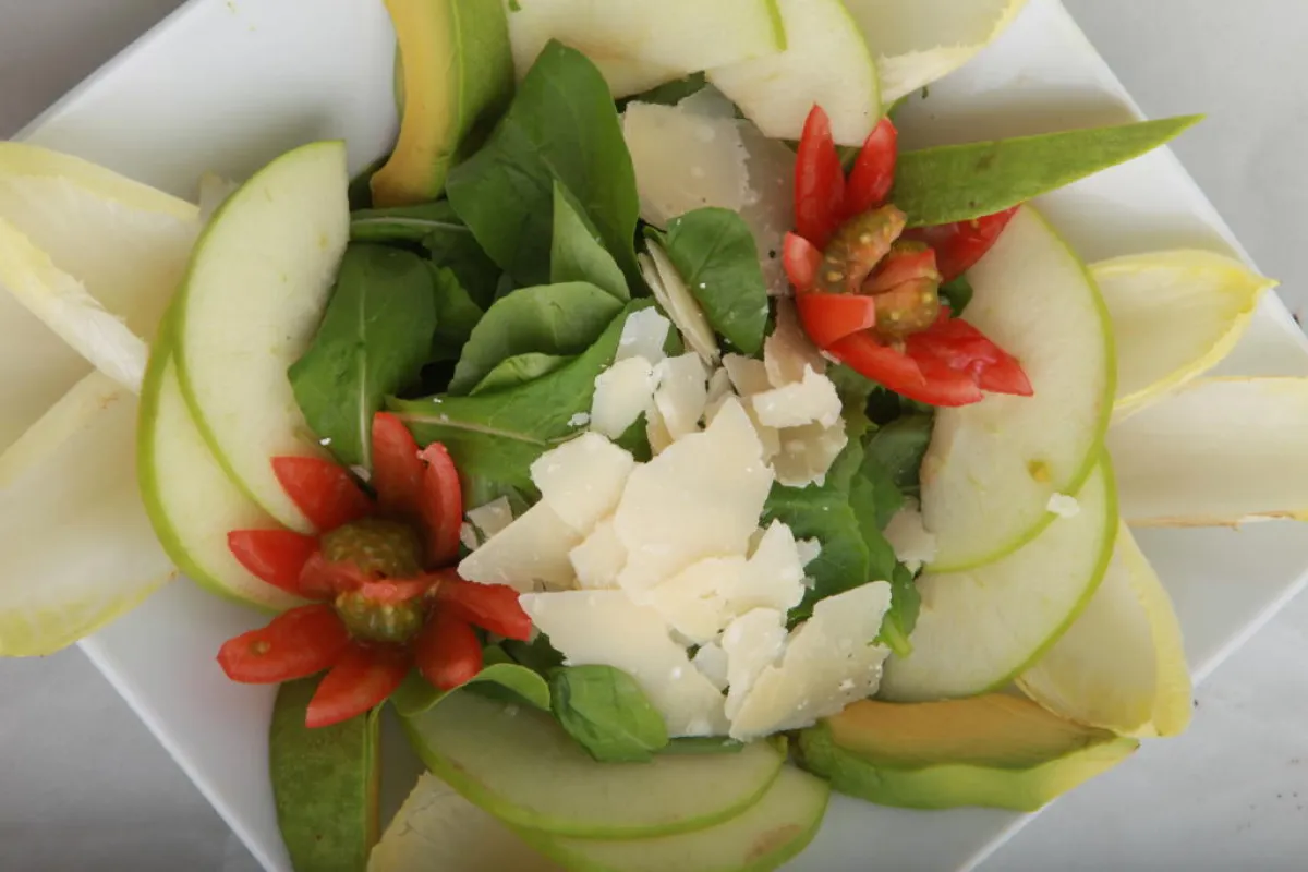 5-طريقة التقديم: توزع في دائرة طبق التقديم أوراق الأنديف التي لم تستخدم، وفي الوسط يوضع الخس المقطّع، والأفوكادو في الأعلى والتفّاح على الأطراف.ويزيّن بالبندورة وأوراق الحبق الخضراء والجبن.