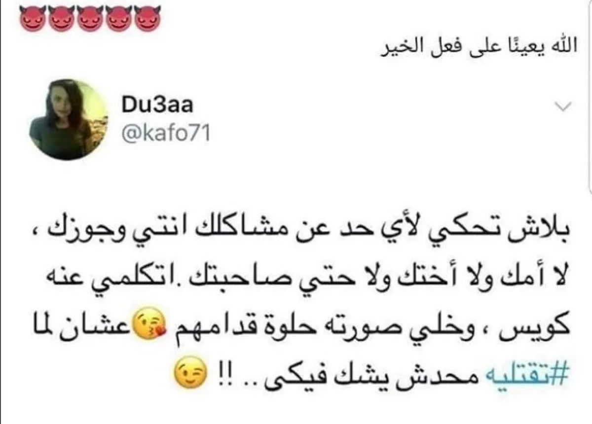 أعادت الفنانة آيتن عامر نشر تعليق لإحدى الفتيات، عن قتل الأزواج تنصح فيه الفتاة السيدات بعدم الحديث عن مساوىء أزواجهنّ أمام أمهاتهنّ أو أيّ شخص، وأن تحتفظ بكل أسراره ومشاكله لنفيها، حتى لا تقع في دائرة الشك عندما تقتله.