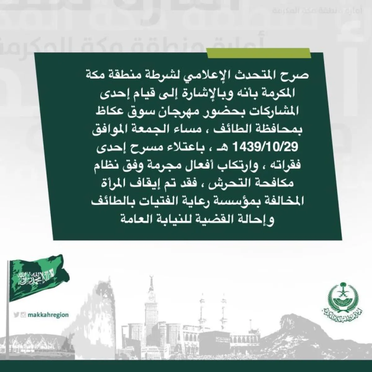 وقال: "إشارة إلى اعتلاء إحدى الحاضرات مسرح مهرجان سوق عكاظ في محافظة الطائف، مساء الجمعة 1439/10/29 هـ، عند تقديم إحدى الفقرات، وارتكاب فعل مجرَّمٍ وفق نظام مكافحة التحرُّش، فقد تم توقيف الفتاة المخالفة في مؤسسة رعاية الفتيات بالطائف".