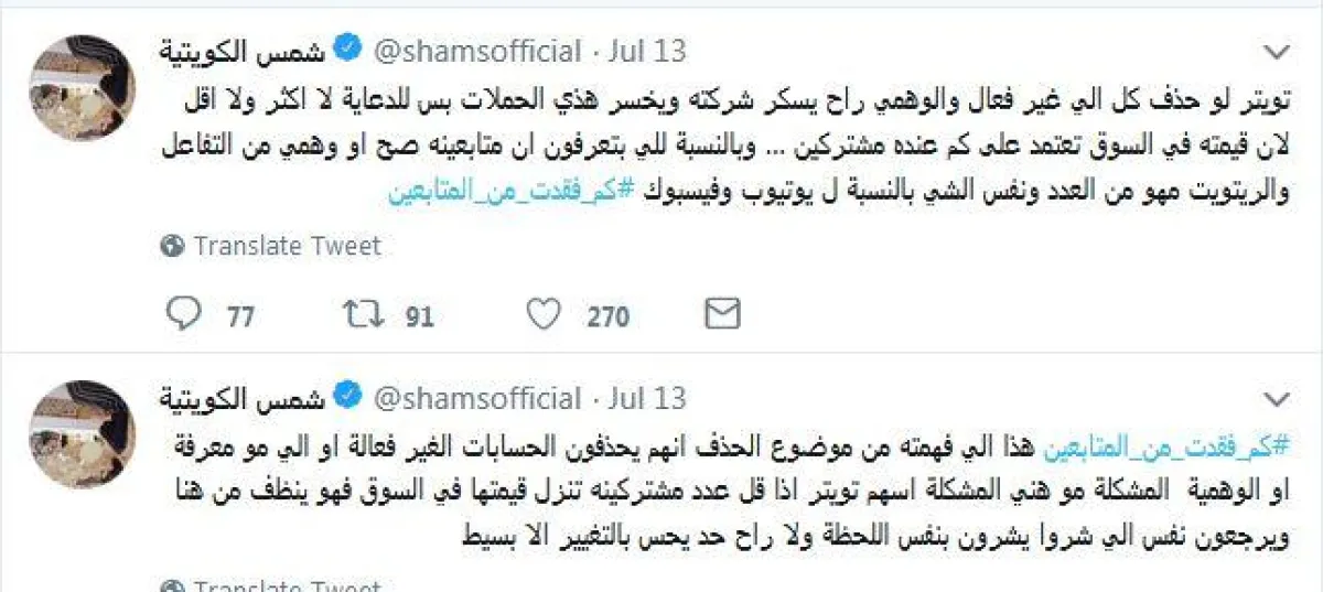 خسرت الفنانة شمس الكويتية 200 ألف متابع، وقد علّقت على حملة تويتر بقولها "اللي فهمته من موضوع الحذف انهم يحذفون الحسابات الغير فعالة او اللي مو معرفة او الوهمية المشكلة مو هني المشكلة اسهم تويتر اذا قل عدد مشتركينه تنزل قيمتها في السوق فهو ينظف من هنا ويرجعون نفس اللي شروا يشرون بنفس اللحظة ولا راح حد يحس بالتغيير الا بسيط".