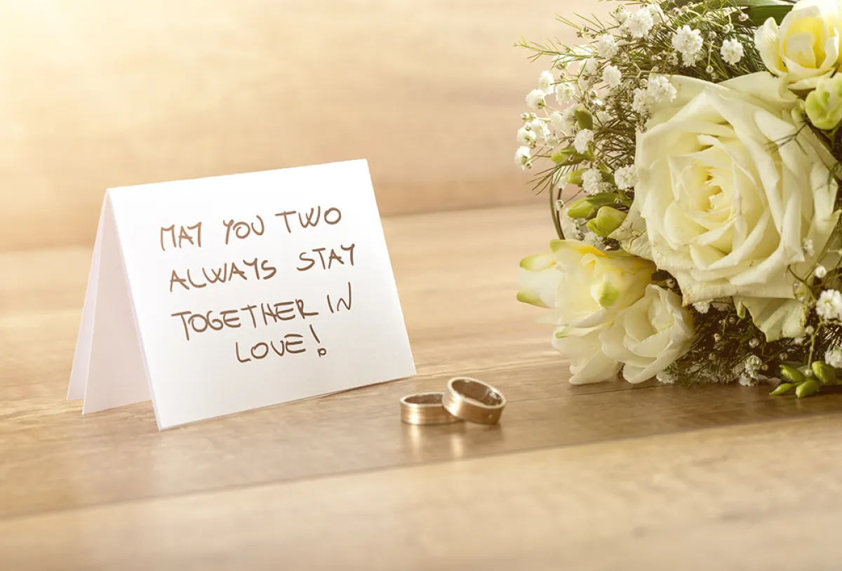 الجملة الشهيرة "بارك الله لكما وبارك عليكما"، فبالرغم من أنها تقليدية، لكن لا تبطل موضتها أبدًا، ومازالت مستخدمة إلى الآن، ويمكنكِ اختيار الصورة المناسبة لكتابة هذه العبارة عليها، مثل صورة لـ خاتم الزفاف، أو لعروسين تتشابك أيديهما.