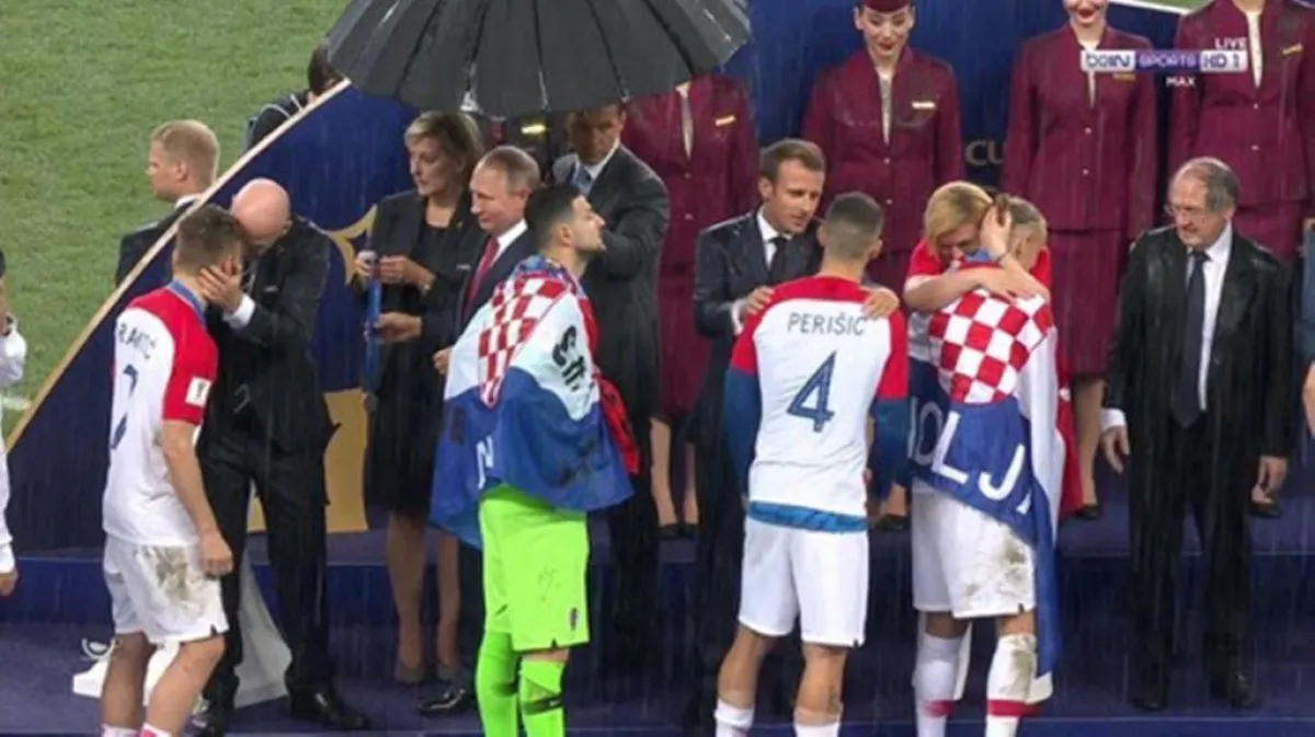 وبعد فترة من هطول الأمطار، تداركت اللجنة المنظمة الأمر، وتم إحضار مظلة لرئيسة كرواتيا والرئيس الفرنسي، لكن بعد فوات الأوان، ولم تُظهر رئيسة كرواتيا انزعاجها بسبب المطر، واستمرت في معانقة لاعبي المنتخب الكرواتي ومواساتهم.