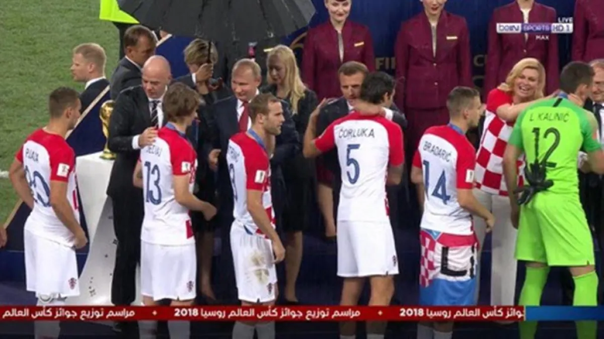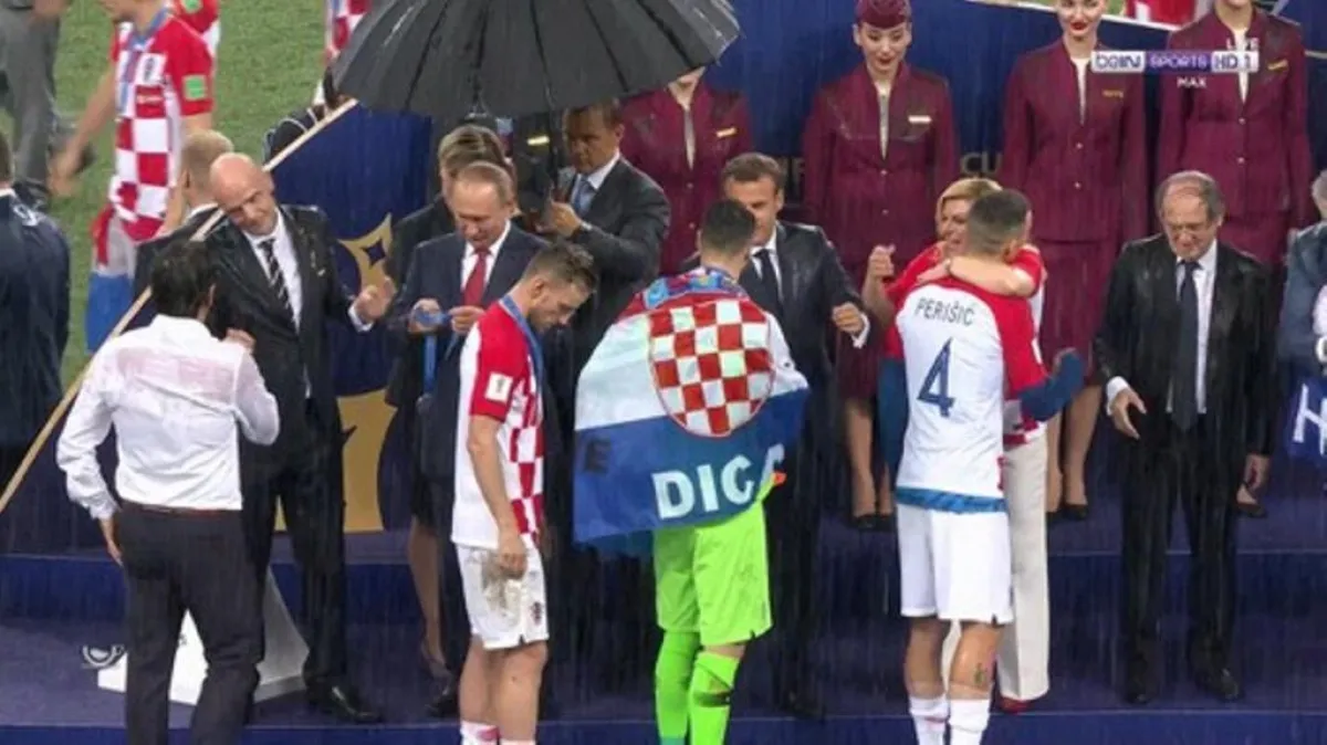 وفور سقوط المطر في الملعب، أحضر مساعدو الرئيس الروسي بوتين مظلة لحمايته من الأمطار على الفور، دون اهتمام بباقي الحضور، وقد ظل واقفًا أسفل المظلة وحيدًا، فيما أدى هطول الأمطار بغزارة الى إفساد شعر رئيسة كرواتيا.