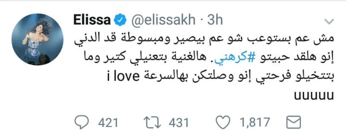 وكتبت إليسا في تغريدتها" مش عم بتسوعب شو عم بيصير ومبسوطة قدّ الدني أنو هلقد حبيتو كرهني. هالغنية بتعنيلي كتير وما بتتخيلو فرحتي إنو وصلتكن بهالسرعة I love u".