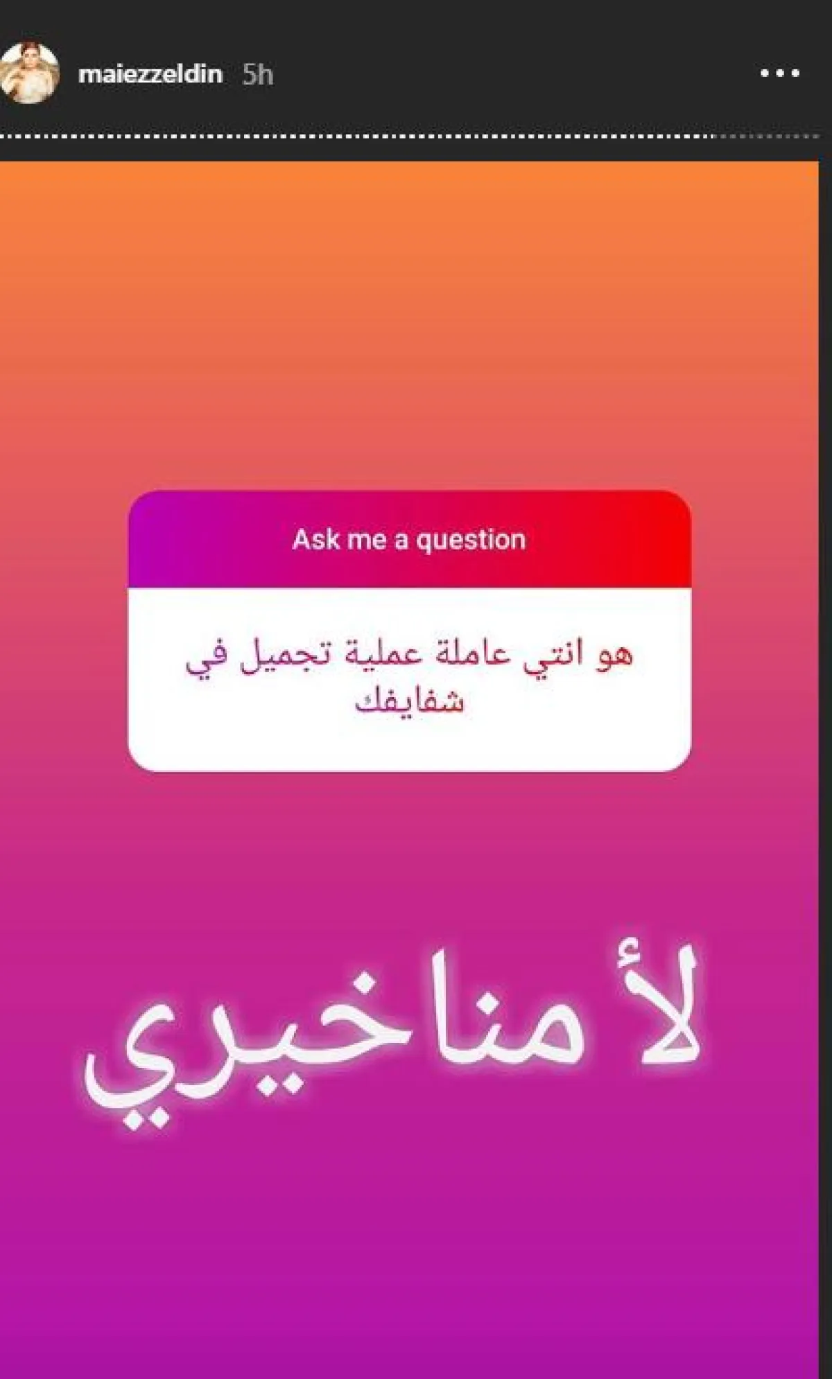 ونفت مي عز الدين شائعة الخضوع لجراحة تجميل للشفاه، وقالت إنها خضعت لجراحة في الأنف فقط، كما تقوم برسم التاتو في لندن.