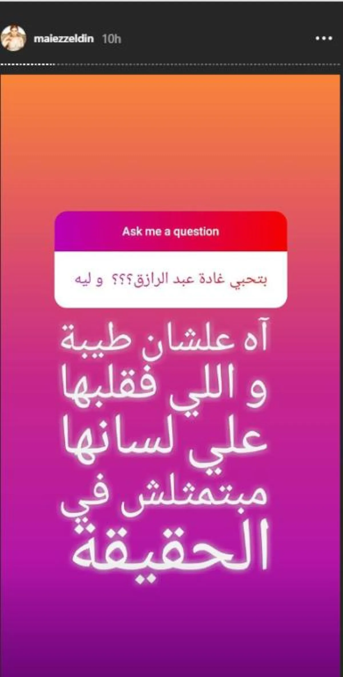 أشارت مي إلى أنها تحب الفنانة غادة عبد الرازق لأنها طيبة، ولا تمثّل في حياتها الشخصية، وقالت: اللي في قلبها على لسانها.