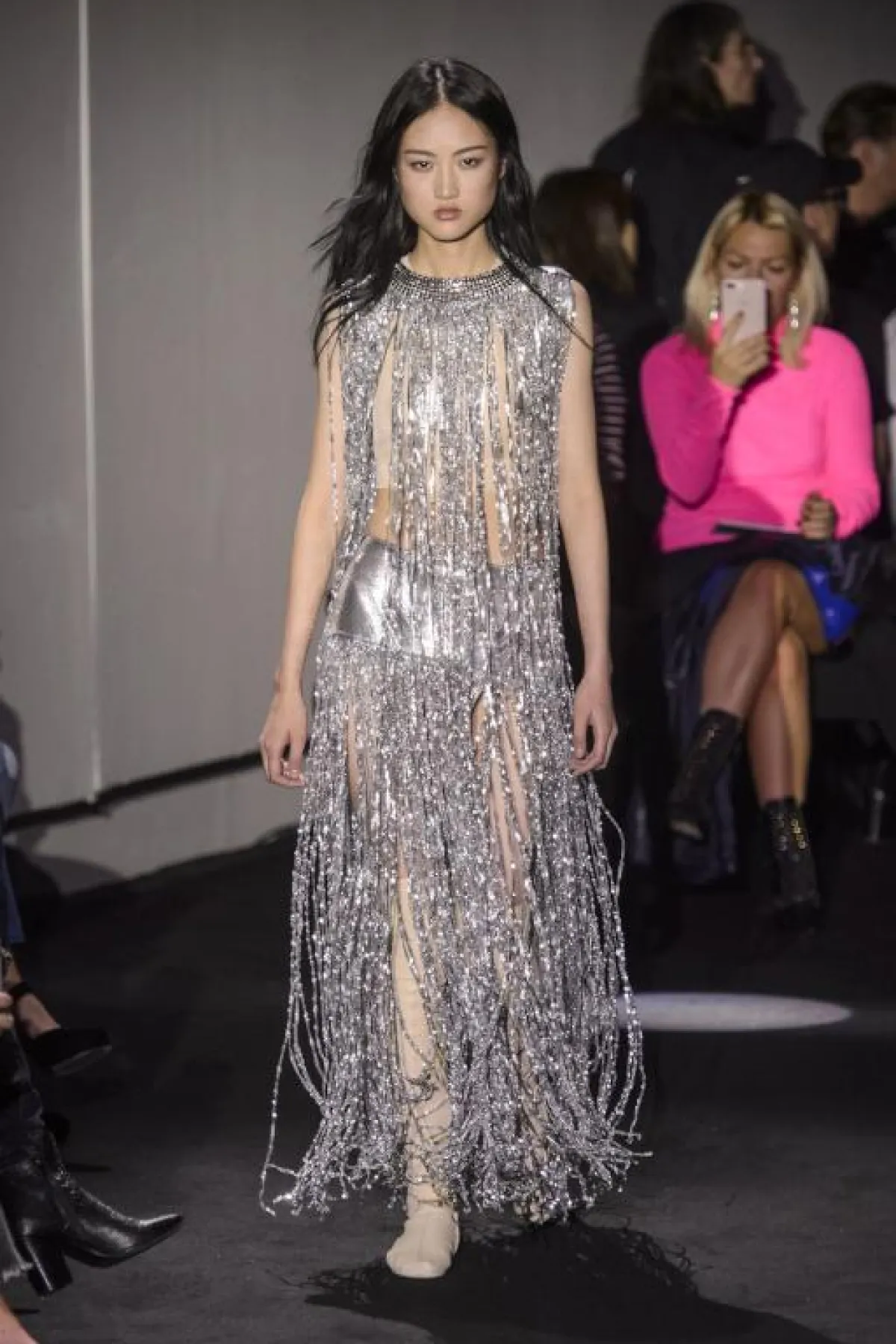 يمكنكِ التغيير قليلًا بارتداء الفساتين الماكسي الطويلة، المتدرجة الألوان مثل هذا الفستان الكحلي، مع لون الفوشي أسفل الركبة، لإطلالة لافتة.