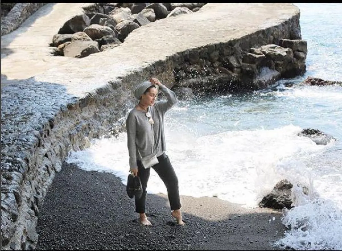 و اختارت الفاشنيستا صوفيا غودسون نفس الخامة لكن على شكل بدلة سباحة عبارة عن توب طويل، وبنطلون ضيق، وزينت الإطلالة بقبعة خوص كبيرة.