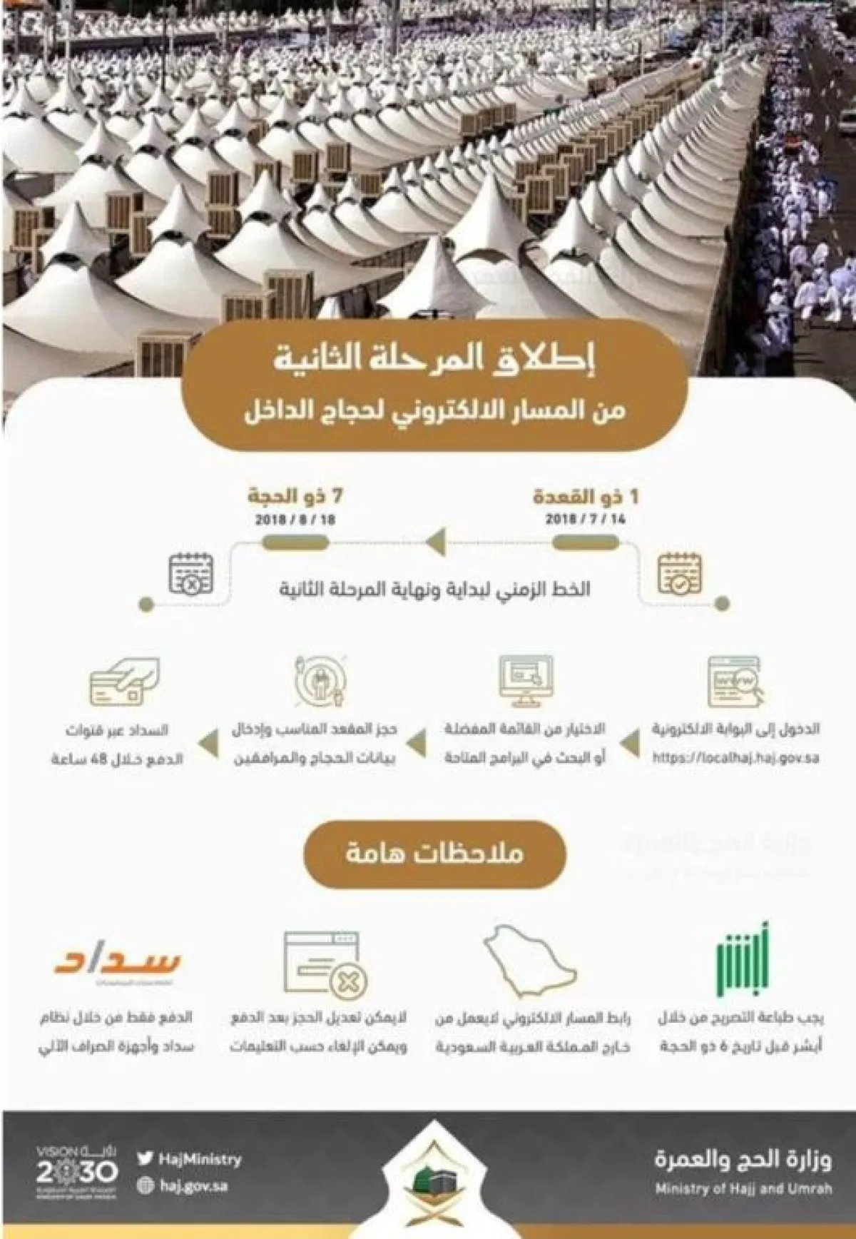وبدأت الوزارة استقبال طلبات تسجيل حجاج الداخل للمواطنين والمقيمين بالمملكة والذين يرغبون في أداء مناسك حج هذا العام 1439هـ عبر المسار الإلكتروني للحج، يوم السبت 1 ذي القعدة 1439، الموافق 14 يوليو 2018، وحتى 7 ذي الحجة 1439 الموافق 18 أغسطس 2018.