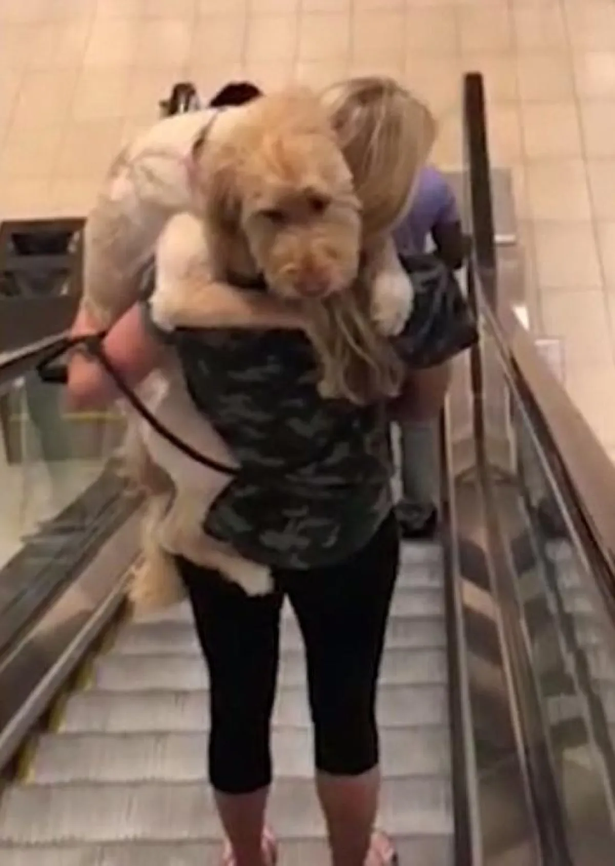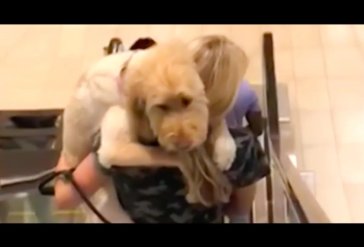 وبحسب "ديلي ميل" بدا في الفيديو أن الكلب الذي يصل وزنه إلى 45 رطلاً خائفاً من السلم المتحرك، فحملته مالكته كالطفل، ونزلت به وهو يتشبث بها فنراه ينظر، ويتلفت بعصبية وخوف بينما تحتضنه مالكته بإحكام.