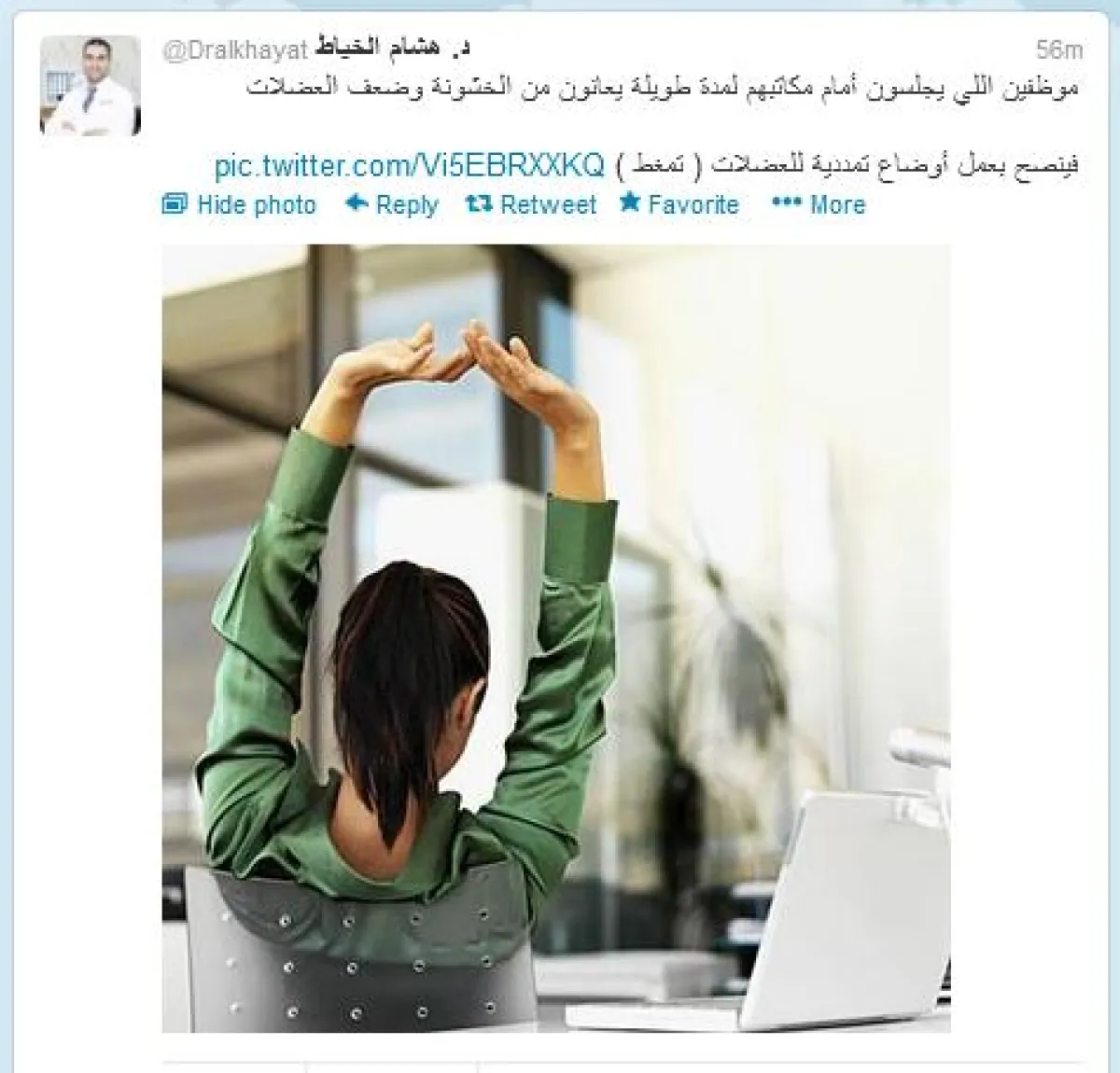 حيث إنه حذر من خلال حسابه على تويتر @Dralkhayat من أضرار الجلوس لساعات طويلة بتغريدته التي جاء فيها: "الموظفون اللي يجلسون أمام مكاتبهم لمدة طويلة يعانون من الخشونة وضعف العضلات فينصح بعمل أوضاع تمددية للعضلات (تمغط)".