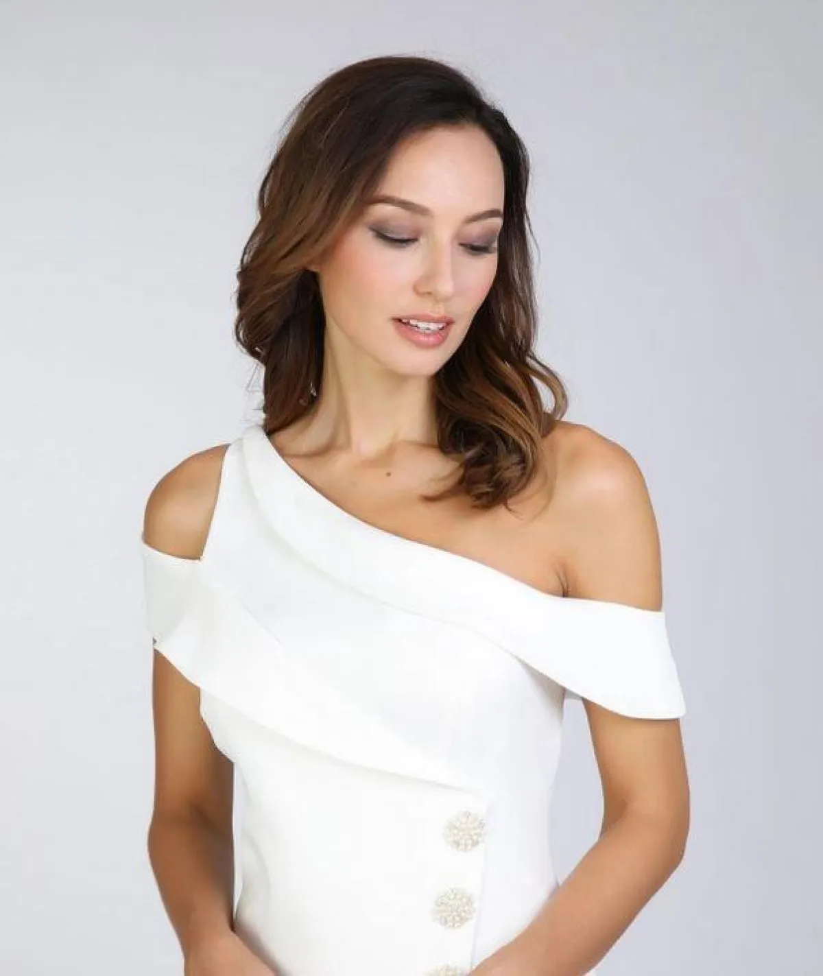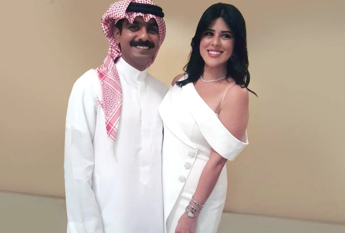 انتشرت صور عدة تجمع العريس بعروسه، وقد اختارت اطلالة ناعمة وهي عبارة عن فستان باللون الأبيض من ماركة فيمي ناين وسعره 239 درهم، وتميز بتصميمه اللافت ذي الأكمام المنسدلة أو Off Shoulder. وأكملت العروس اطلالتها بتسريحة بسيطة.