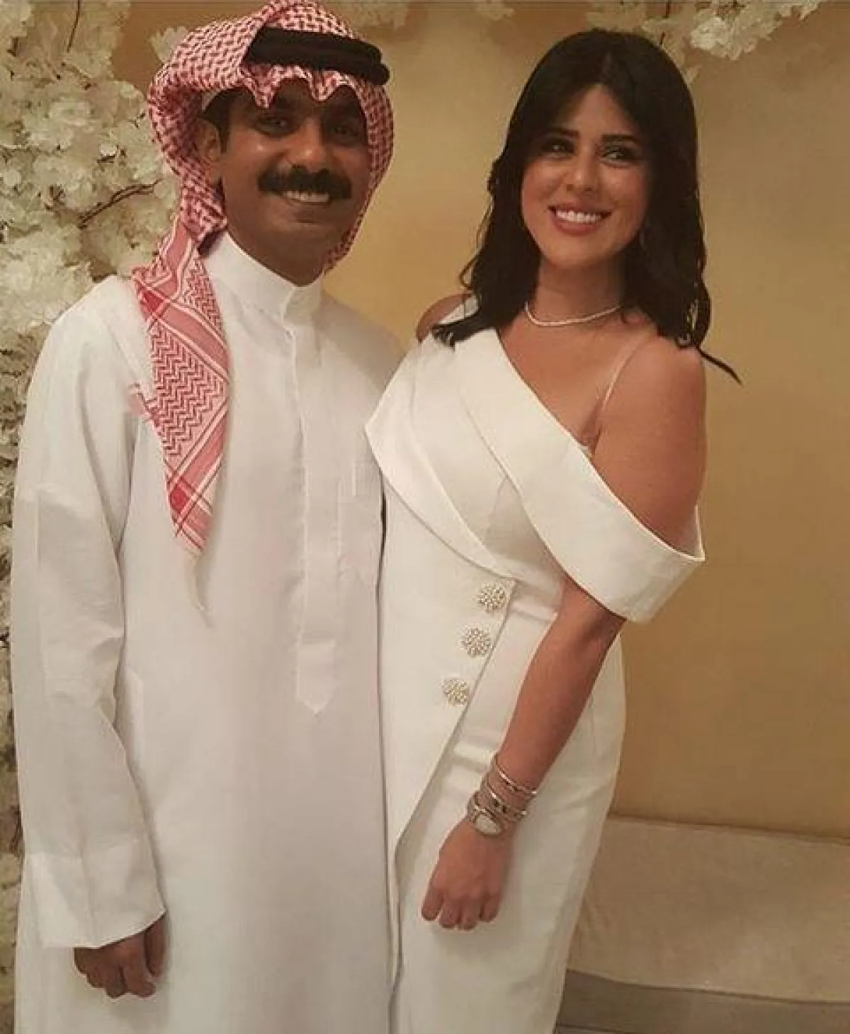 أما العريس فقد ظهر باللباس البحريني التقليدي باللون الأبيض.