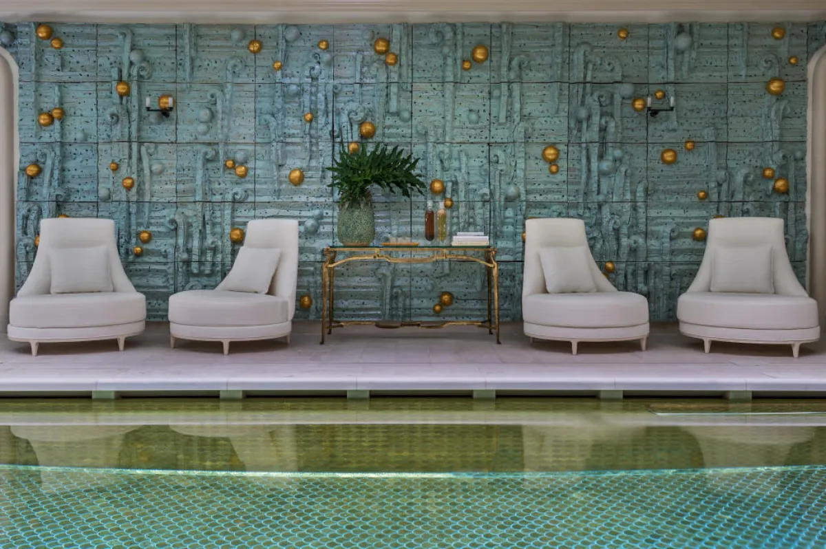 واجه القيِّمون على الفندق تحدِّيًا، حين قرَّروا بناء حوض للسباحة و"سبا"، إذ كان الفندق في حاجة ماسة اليهما ليحصل على تصنيف "بالاس" أو "قصر". على عمق 541 مترًا مربعًا، حُفر تحت الأرض لبناء المسبح. وجاءت النتيجة في مستوى التحدِّي الضخم. وأوكلت مهمَّة تصميم ديكور حوض السباحة إلى المصمِّم تريستان أوار، الذي زيَّن أرضيَّة المسبح بـ177.600 قطعة من الذهب شبيهة بحراشف الأسماك. كما غطَّى جدران المسبح بلوحة جداريَّة منقوشة، تتخلَّلها كريات مذهبة، من تصميم دار "بيتر لان" الأمريكيَّة.