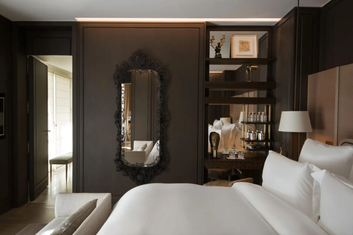 غاصت المصمِّمة ألين أسمر دامان، عند تولِّي تصميم هذه الشقَّة في التفاصيل المتعلِّقة بالدوق دو كريون، الذي اشترى الفندق سنة 1788، ولكنَّه لم يعش فيه طويلًا، بسبب اندلاع الثورة الفرنسيَّة بعد التاريخ المذكور بسنة. وقد حافظت المصمِّمة على عدد من الرموز التي تُذكِّر بطبقة الدوق الأرستقراطية، وخصوصًا في الصالون ذي السقف المنحوت والمذهَّب، والجدران المزدانة برسوم لنباتات، فضلًا عن إطارات الأبواب والنوافذ المصنوعة من الخشب المنحوت والمطلي بالذهب. وقد استعانت دامان بنحاتة البرونز إنغريد دونات، والأخيرة هي الأشهر في باريس، حتَّى تُصمِّم خصِّيصًا لهذه الشقَّة "كونسولًا" من البرونز المنحوت وقطع ديكور أخرى، من بينها: مجسَّم نمر ووجه رجل وضعا على رف من رفوف الـ"كونسول". أمَّا ديكور غرفة النوم، فقد جاء خاليًا من أي زخارف. جدران الغرفة مكسوَّة بالخشب، ومثبَّت على أحدها رفوف المكتبة المصنوعة من المادة ذاتها، بينما زُيِّن جدار آخر بمرآة عصريَّة صُنعت جوانبها على هيئة شبكة من الحلقات الفولاذ الدائريَّة المتداخلة ببعضها البعض. وفي الغرفة، عدد من المجسَّمات على هيئة طيور وشمعدان من البرونز. وداخل الحمَّام، يسود الرخام البنِّي الفاخر، وهو يتناغم مع لون الحنفيات والإكسسوارت الأخرى.