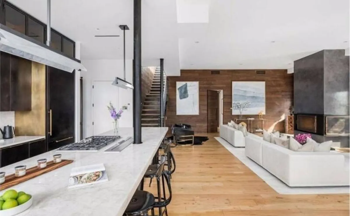 يتبع المطبخ الطراز الصناعي في تصميمه، نظرًا لحضور الحديد فيه، بالتناغم مع الرخام الأبيض الذي يغطِّي أسطح العمل.