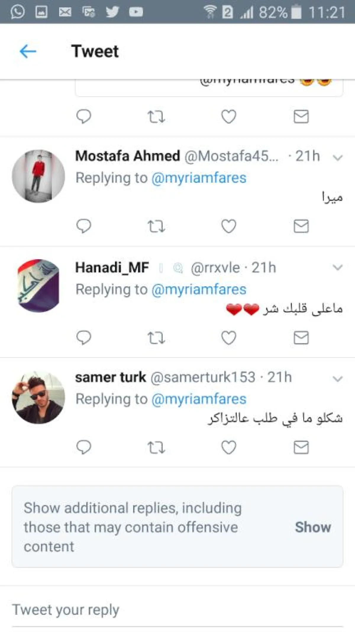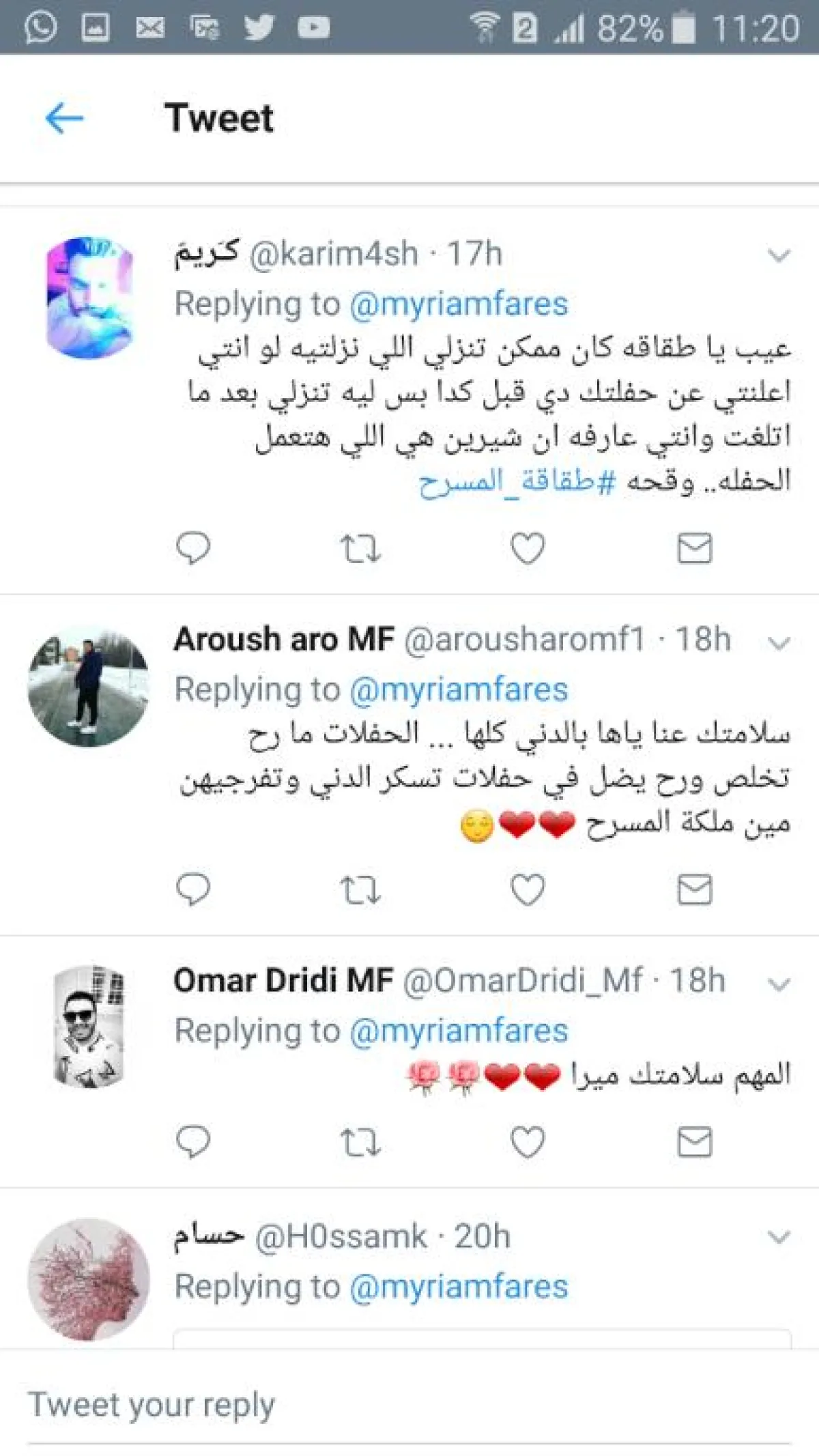 في المقابل أعادت الصفحة نفسها نشر الإعلان الخاص بحفل ميريام فارس ، للتأكيد أنها كانت مرتبطة بالحفل، وأنها اعتذرت فعلًا عنه، وتمنّى جمهورها لها الشفاء وكتب أحد المغردين: "سلامتِك عنا إياها بالدنيا .. الحفلات ما رح تخلص ورح يضل في حفلات تسكر الدني وتفرجيهن مين ملكة المسرح".