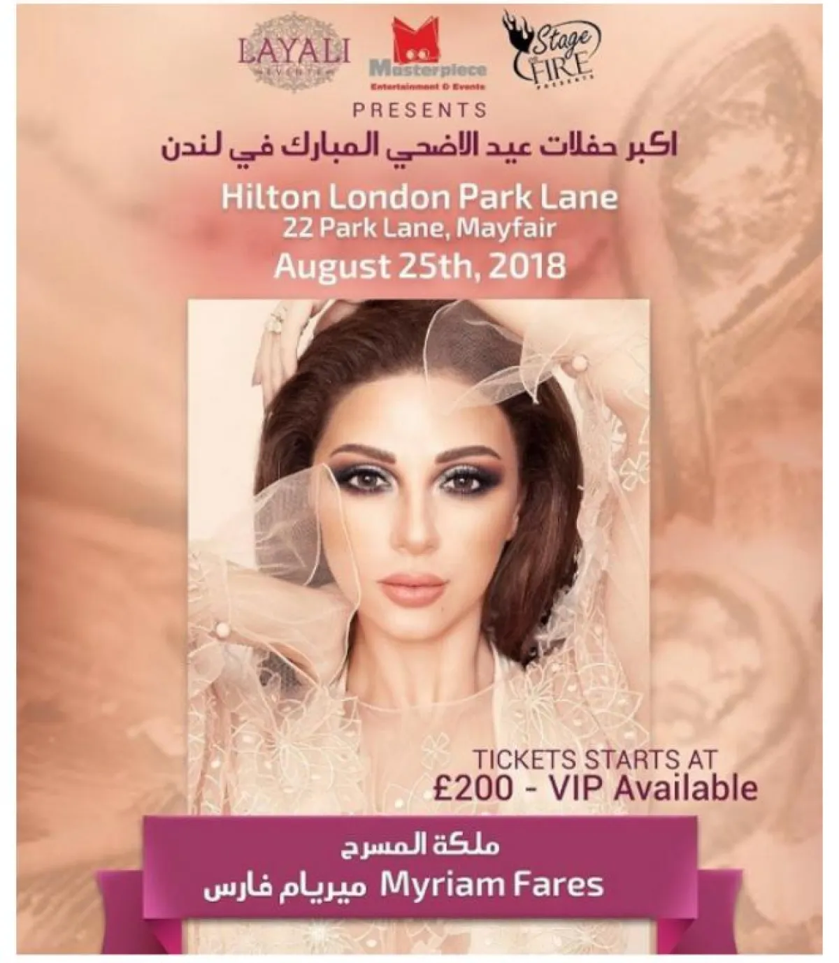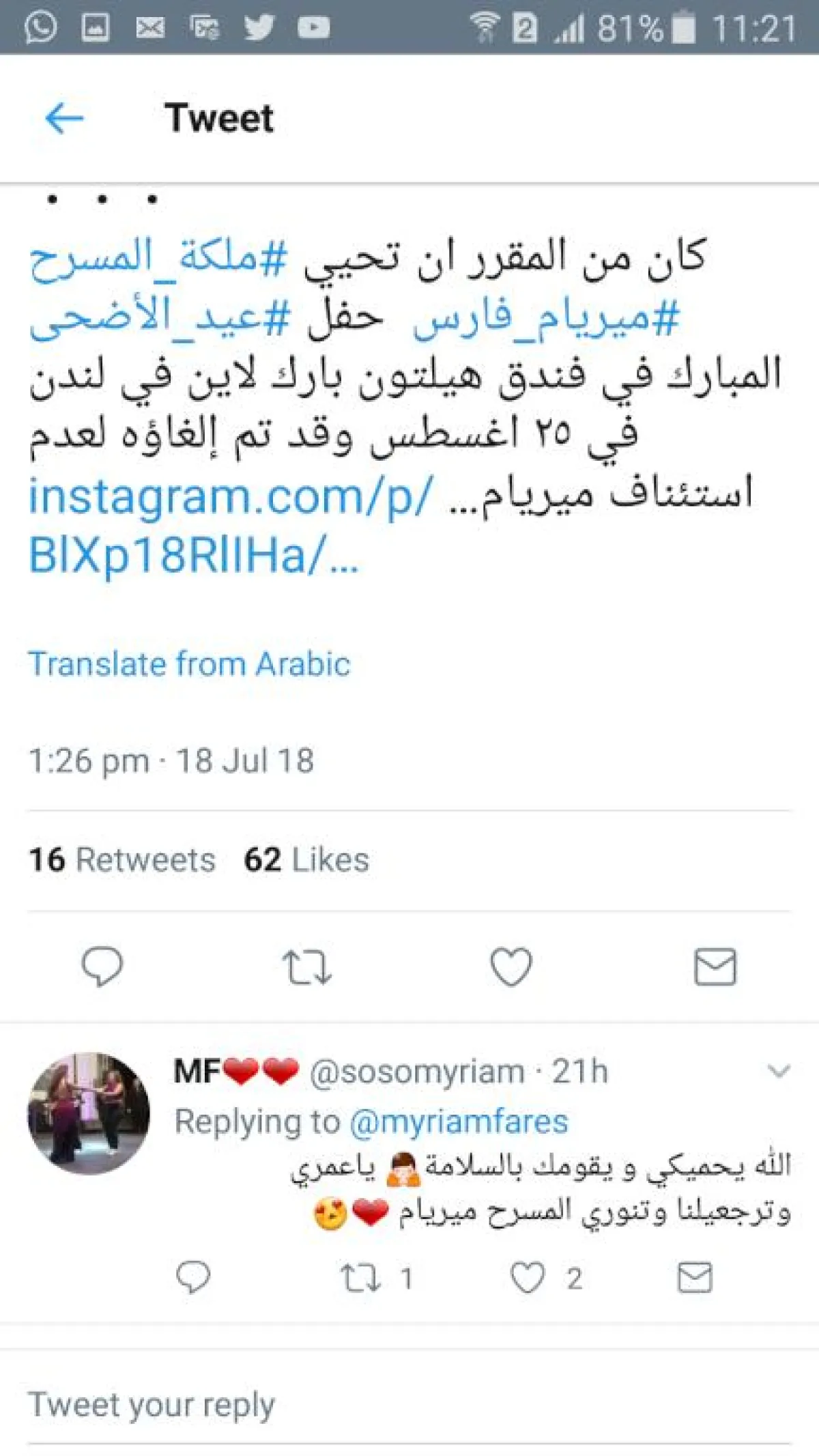 نشرت الصفحة الرسمية الخاصة بـ "فانز" الفنانة ميريام فارس على "انستقرام"، خبرًا يفيد بأنه تم استبدال الفنانة ميريام فارس بالفنانة شيرين عبد الوهاب، لإحياء حفل عيد الأضحى المبارك في فندق هيلتون بارك لاين في لندن في ٢٥ أغسطس، وذلك بعد اعتذار ميريام عنه بسبب حالتها الصحية، كما تم التنوية إلى أنه تم استبدال صورة ميريام في الإعلان بصورة شيرين، ولكنهم نسَوا إزالة لقب ميريام "ملكة المسرح".