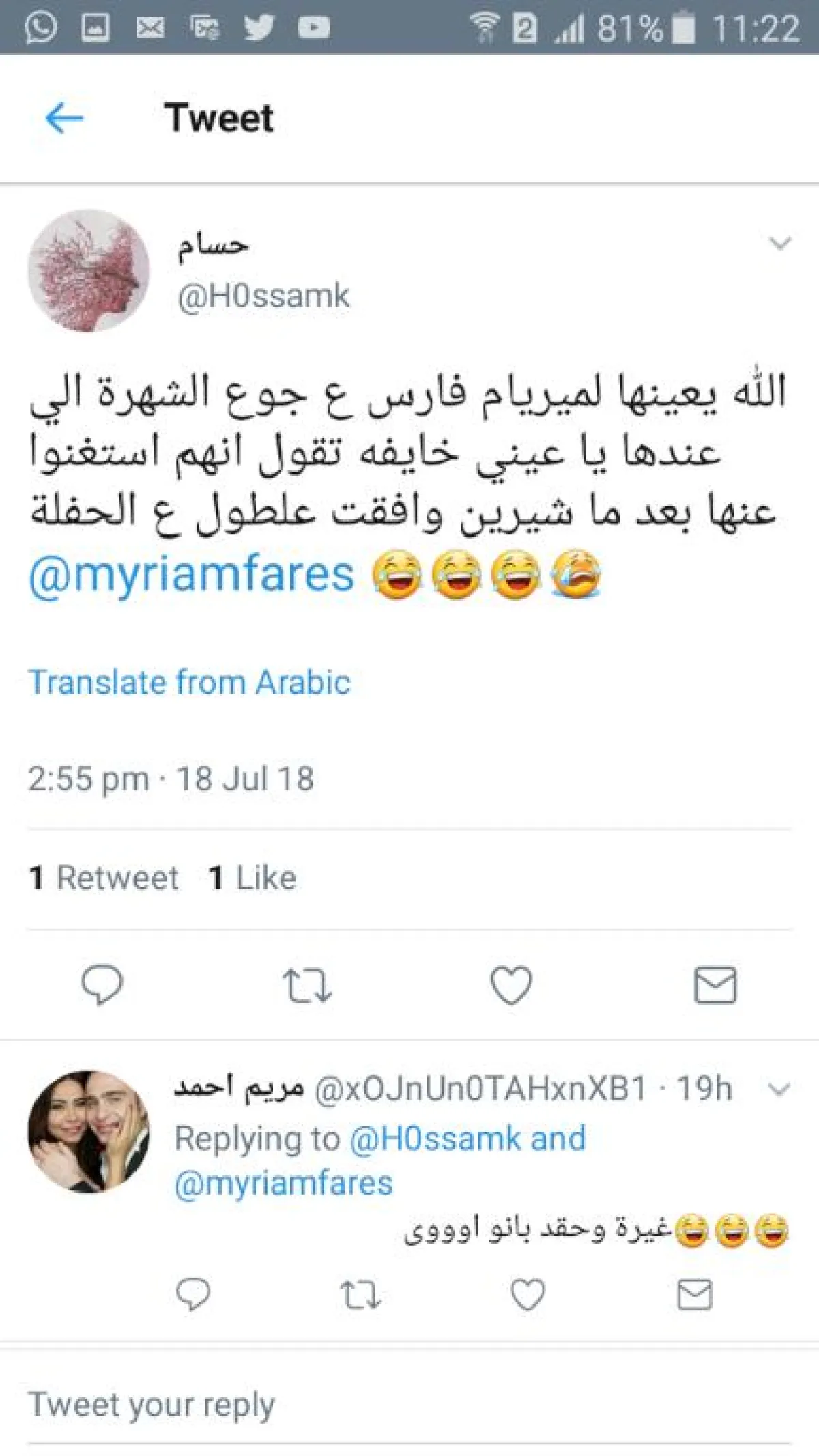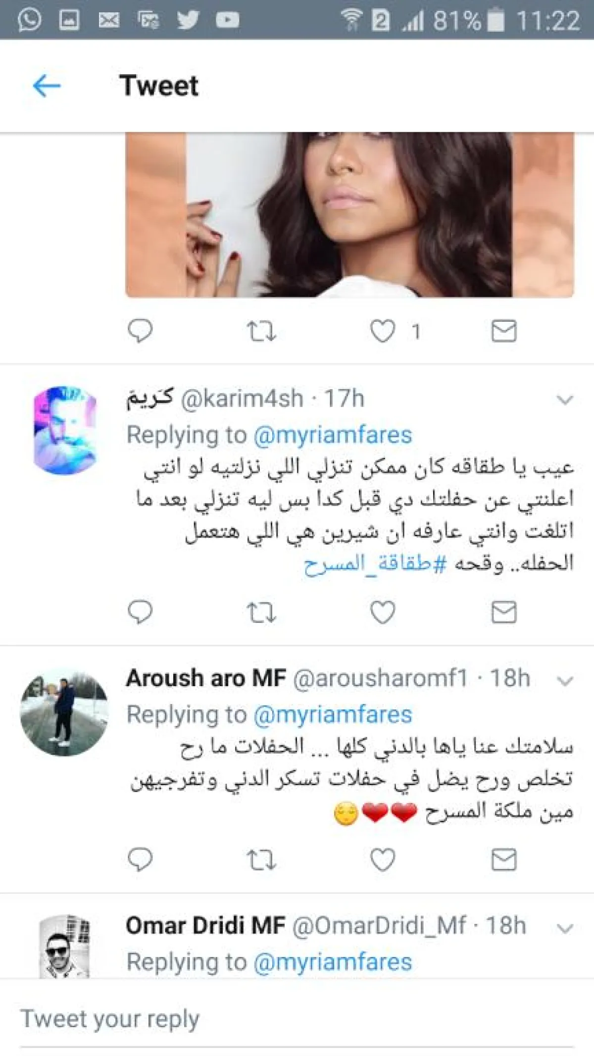 جمهور شيرين عبد الوهاب لم يعجبه الطريقة التي كُتب فيها الخبر فشنّ حملة على ميريام فارس، فكتب أحدهم "الله يعينها لميريام فارس ع جوع الشهرة اللي عندها، يا عيني خايفة تقول إنهم استغنوا عنها بعد ما شيرين وافقت على طول ع الحفلة"، وعلق آخر "غيرة وحقد بانوا أوي"، وأشار ثالث " كان ممكن تنزّلي اللي نزّلتيه لو انتي اعلنتي عن حفلتك دي قبل كدا، بس ليه تنزّلي بعد ما التغِت وإنتي عارفة أن شيرين هي اللي هتعمل الحفلة "، وقال رابع "شكلو ما في طلب عالتذاكر".