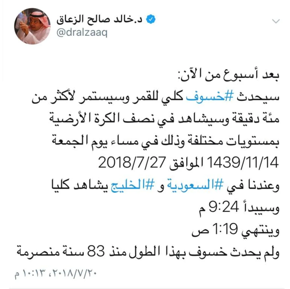 «بعد أسبوع من الآن.. سيحدث خسوف كلي للقمر، وسيستمر لأكثر من مائة دقيقة، وسيشاهد في نصف الكرة الأرضية بمستويات مختلفة، وذلك في مساء يوم الجمعة 1439/11/14، الموافق 2018/7/27، وعندنا في السعودية والخليج يشاهد كليًا. ‏وسيبدأ 9:24 م، وينتهي 1:19 ص، ولم يحدث خسوف بهذا الطول منذ 83 سنة منصرمة.