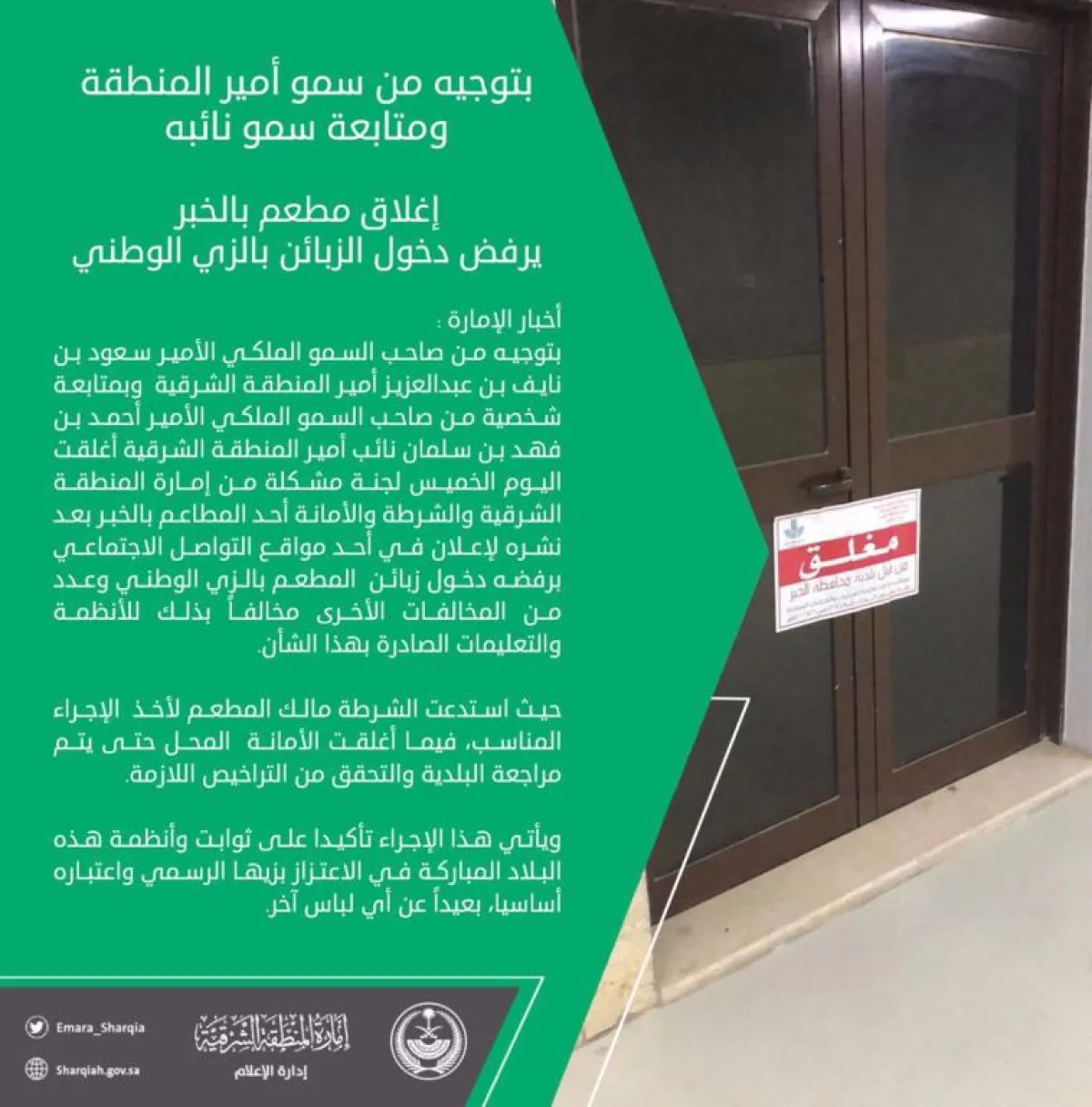 وقد نشرت الإمارة بيانًا جاء فيه: «بتوجيه من الأمير سعود بن نايف بن عبدالعزيز، أمير المنطقة الشرقية، وبمتابعة شخصية من الأمير أحمد بن فهد بن سلمان، نائب أمير المنطقة الشرقية، أغلقت يوم الخميس اللجنة المشكلة من إمارة المنطقة الشرقية والشرطة والأمانة أحد المطاعم بالخبر؛ بعد نشره إعلانًا في أحد مواقع التواصل الاجتماعي برفضه دخول زبائن المطعم بالزيّ الوطني، بالإضافة إلى عدد من المخالفات الأخرى، مخالفًا بذلك الأنظمة والتعليمات الصادرة بهذا الشأن».
