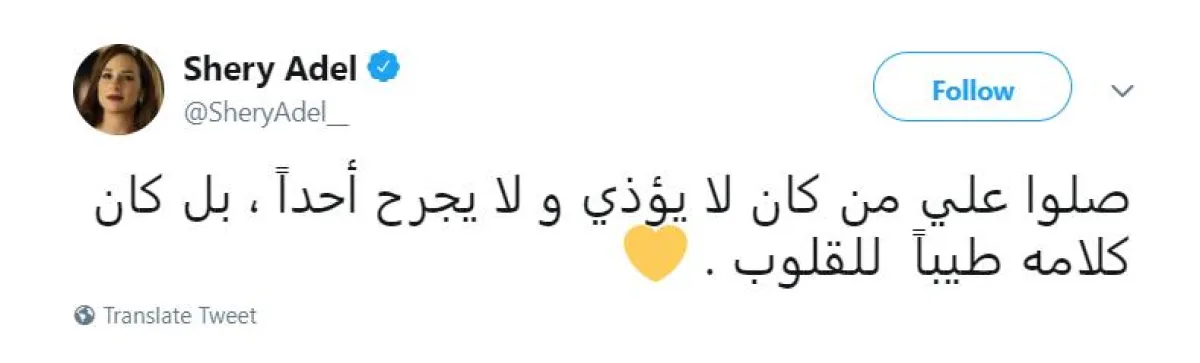 تغريدة شيري عادل الأولى جاءت لتلطيف الأجواء، بعد حملة الهجوم التي لم تتوقف لزواجها من الداعية الديني معز مسعود سرا، وقالت فيها: "صلوا على من كان لا يؤذي ولا يجرح أحدًا، بل كان كلامه طيبًا للقلوب". وتوقعت شيري أن تترك كلماتها أثرا طيبا في نفوس متابعيها، ولكن على العكس، اشتعل الهجوم من جديد، مع تلميحات بأنها صارت تحت سيطرة أفكار زوجها تماما، وليس مستغربا أن تعلن ارتداء الحجاب وأن تتفرغ لتقديم برامج الدعاية الدينية.