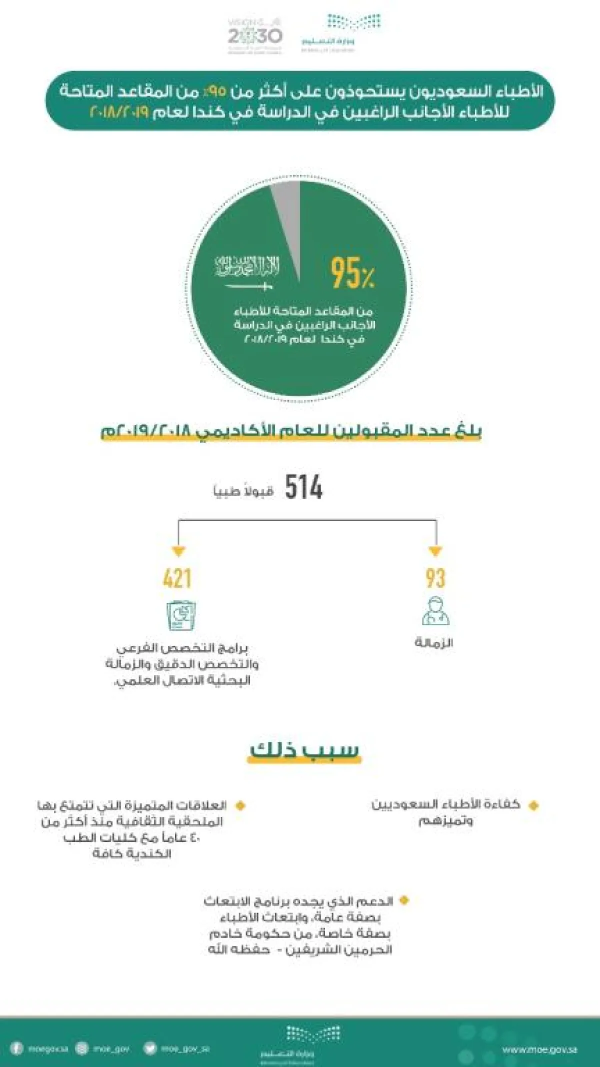 وأرجع السبب في ذلك، بعد توفيق الله، إلى كفاءة الأطباء السعوديين، وتميزهم، والعلاقات المتميزة التي تتمتع بها الملحقية الثقافية منذ أكثر من 40 عاماً مع كليات الطب الكندية كافة، إضافة إلى الدعم الذي يجده برنامج الابتعاث عامةً، وابتعاث الأطباء بشكل خاص، من الحكومة السعودية.