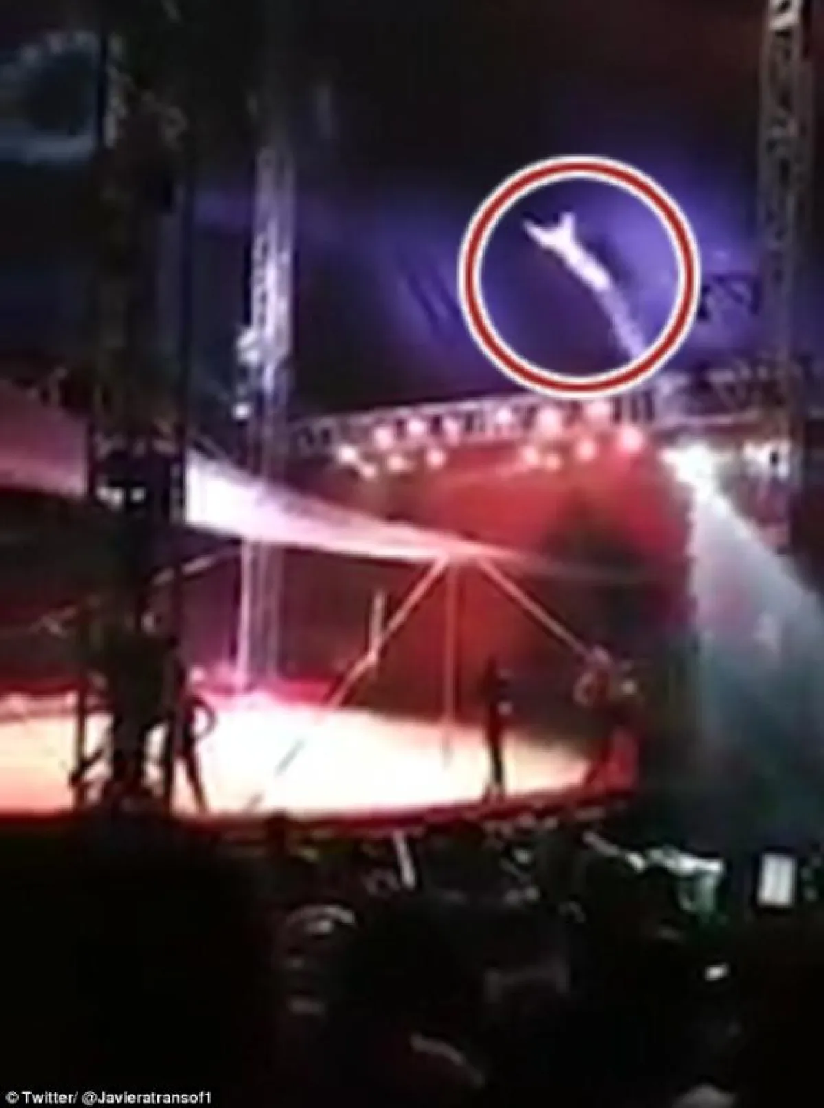 يظهر الفيديو الذي نقله موقع "ديلي ميل" اللحظة المؤلمة التي اندفع فيها أحد أعضاء السيرك بعيداً عن شبكة الأمان وتطاير بين صفوف الجماهير ليقع على الأرض ويصاب بكسر في فكه والركبة.