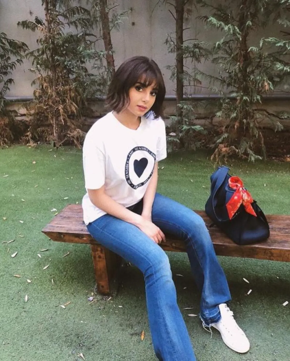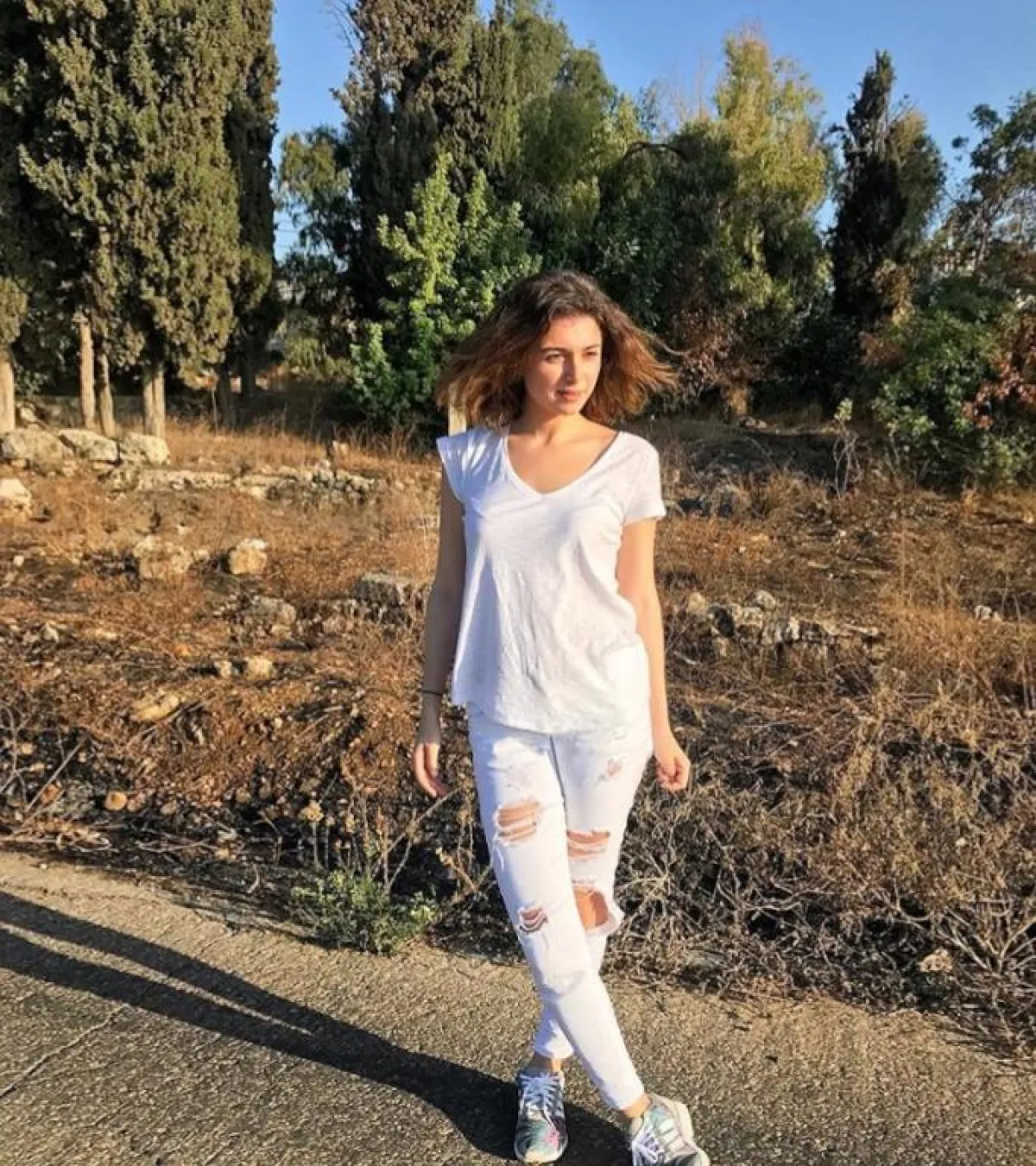 في هذا اللوك اختارت ماريتا الحلاني الجينز الأبيض وقد نسقته مع تيشيرت قطنية من نفس اللون وحذاء رياضي ملون، وقد بدا اللوك عصري وشبابي.