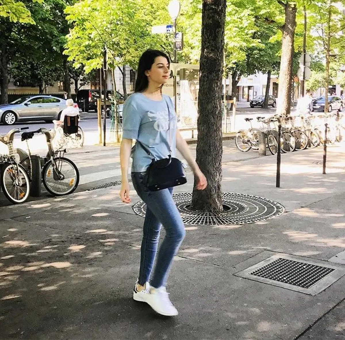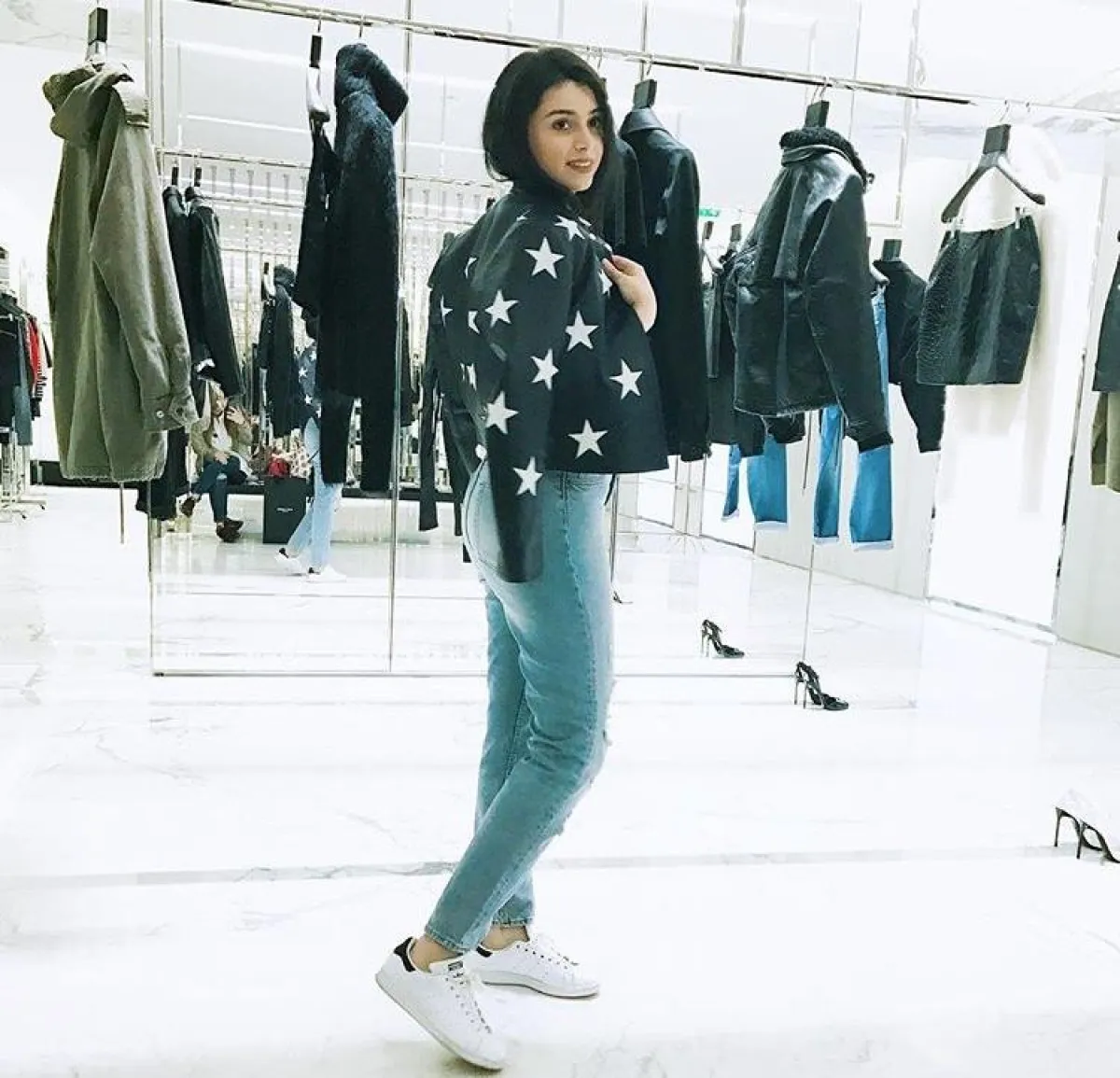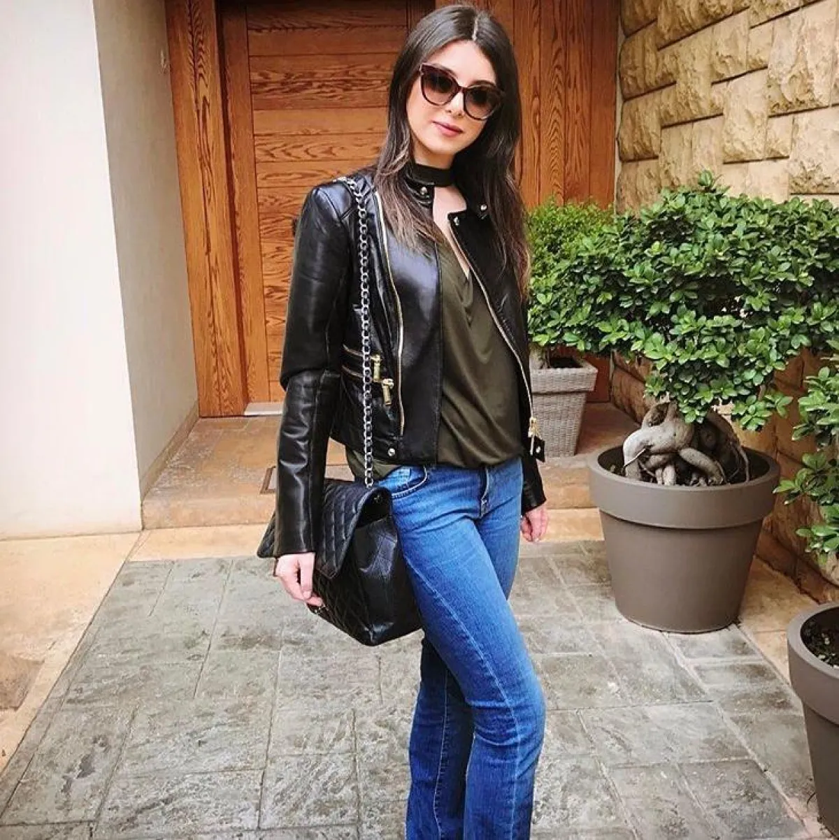 اختارت ماريتا الحلاني اطلالة أنيقة في الجينز حيث نسقت معه توب باللون الزيتي وجاكيت من الجلد الأسود، وحقيبة يد كبيرة بتصميم كلاسيكي من “شانيل” Chanel، ونظارات شمسية كبيرة.